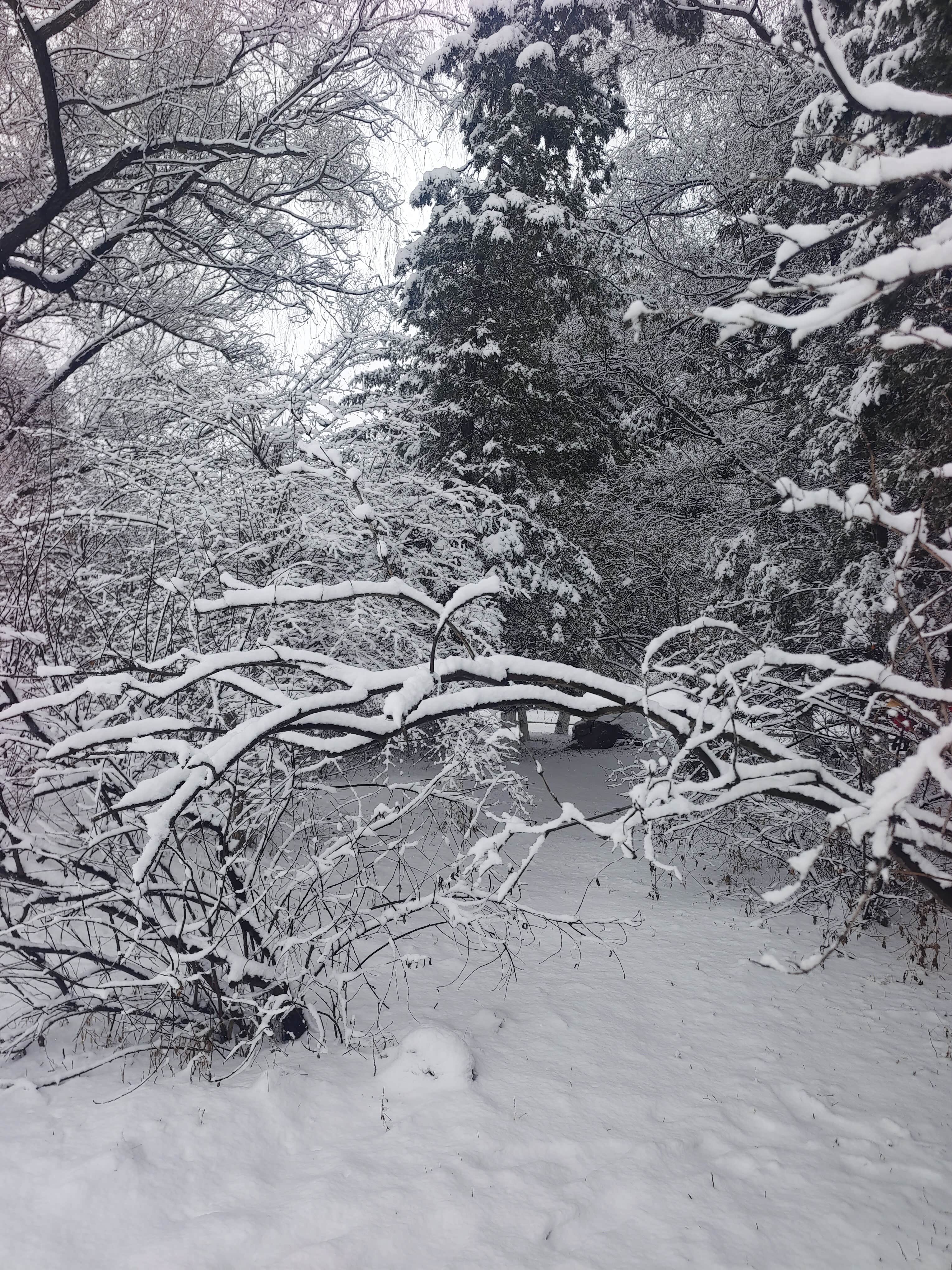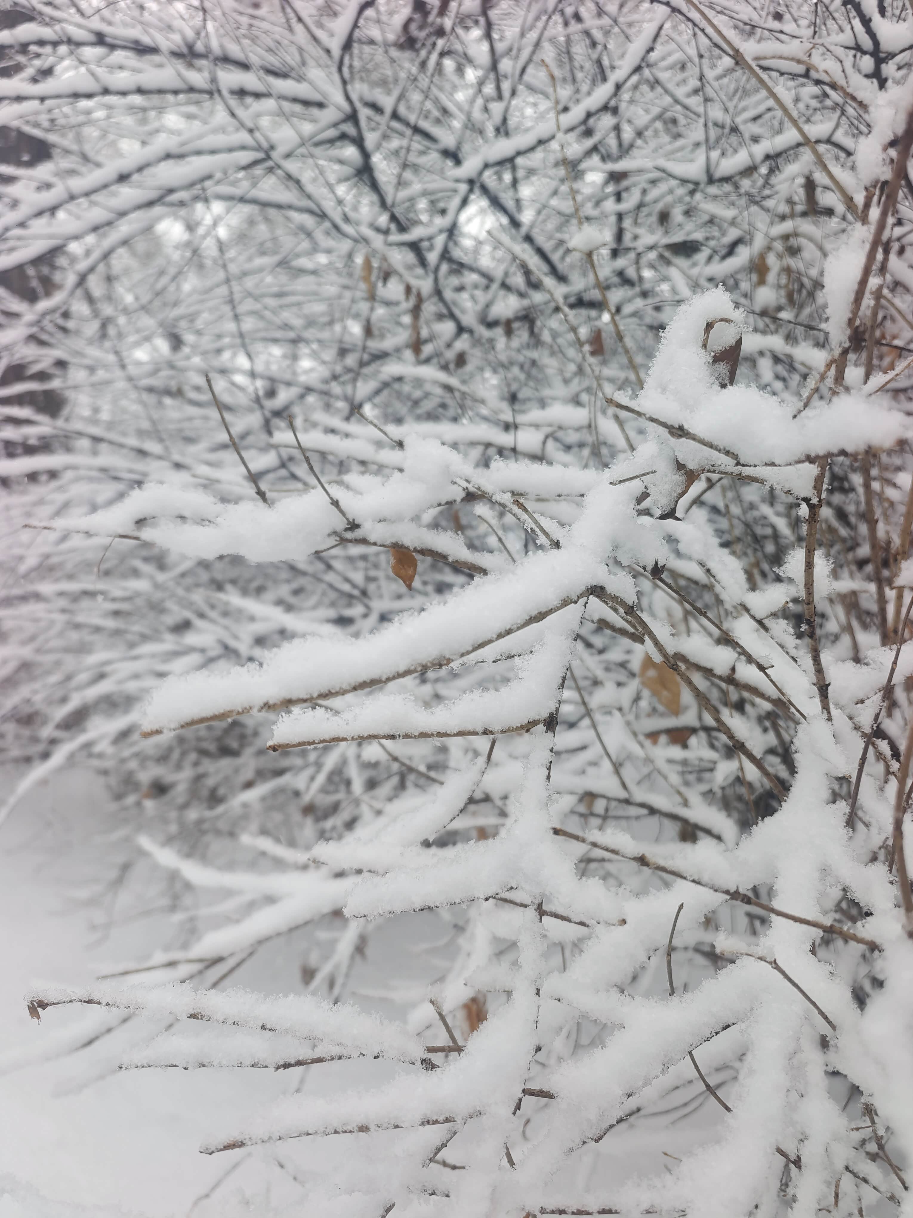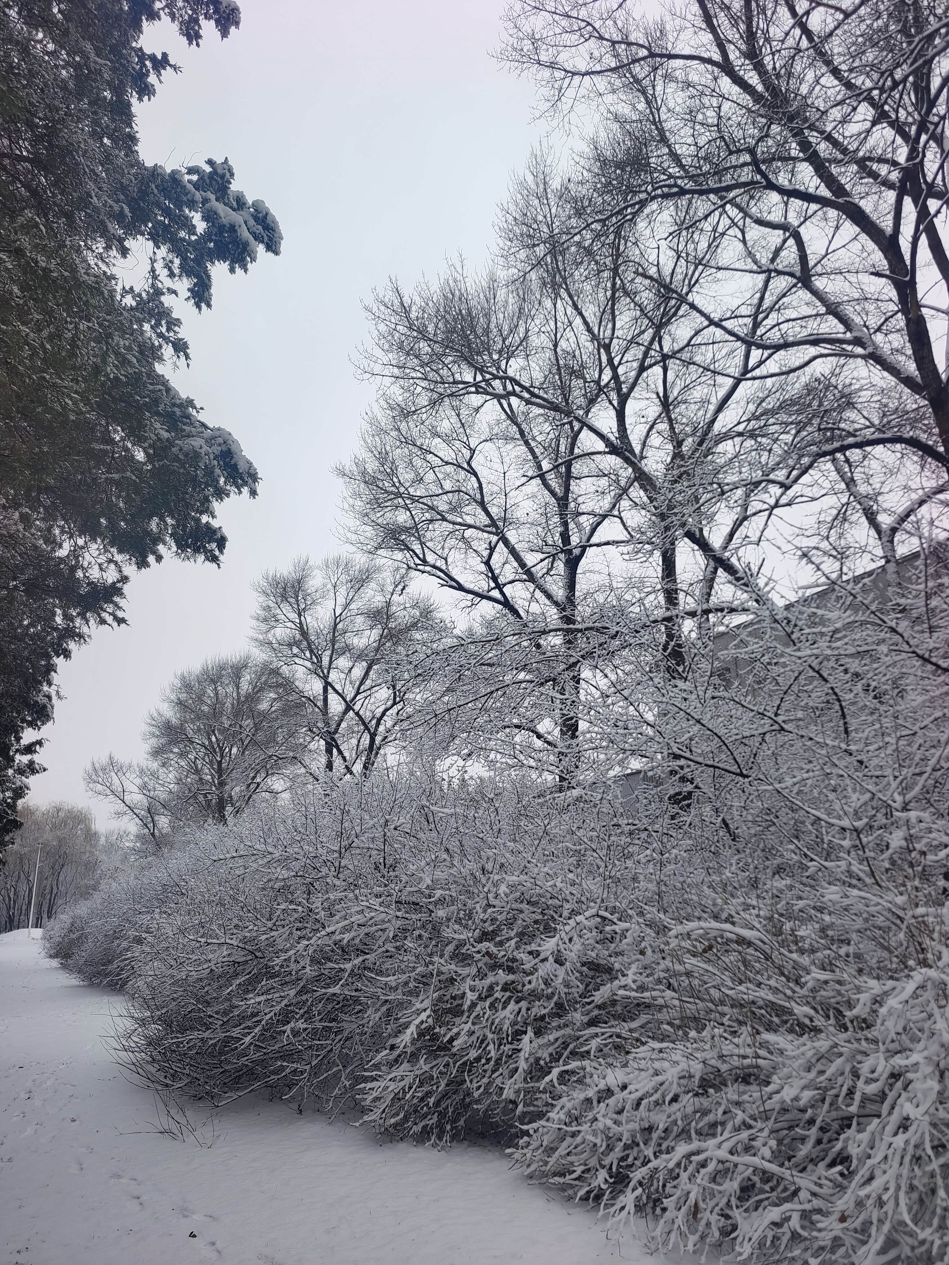 细细的树枝上也站满了雪,毛茸茸的,像白色的毛毛虫。那些平日里纤细的柳条、灌木细枝,此刻都被雪裹得圆滚滚的。雪层顺着枝桠的纹路铺展,边缘泛着细碎的白边,远远望去,就像一只只憨态可掬的毛毛虫,安静地趴在枝头,仿佛下一秒就要顺着枝干缓缓蠕动。