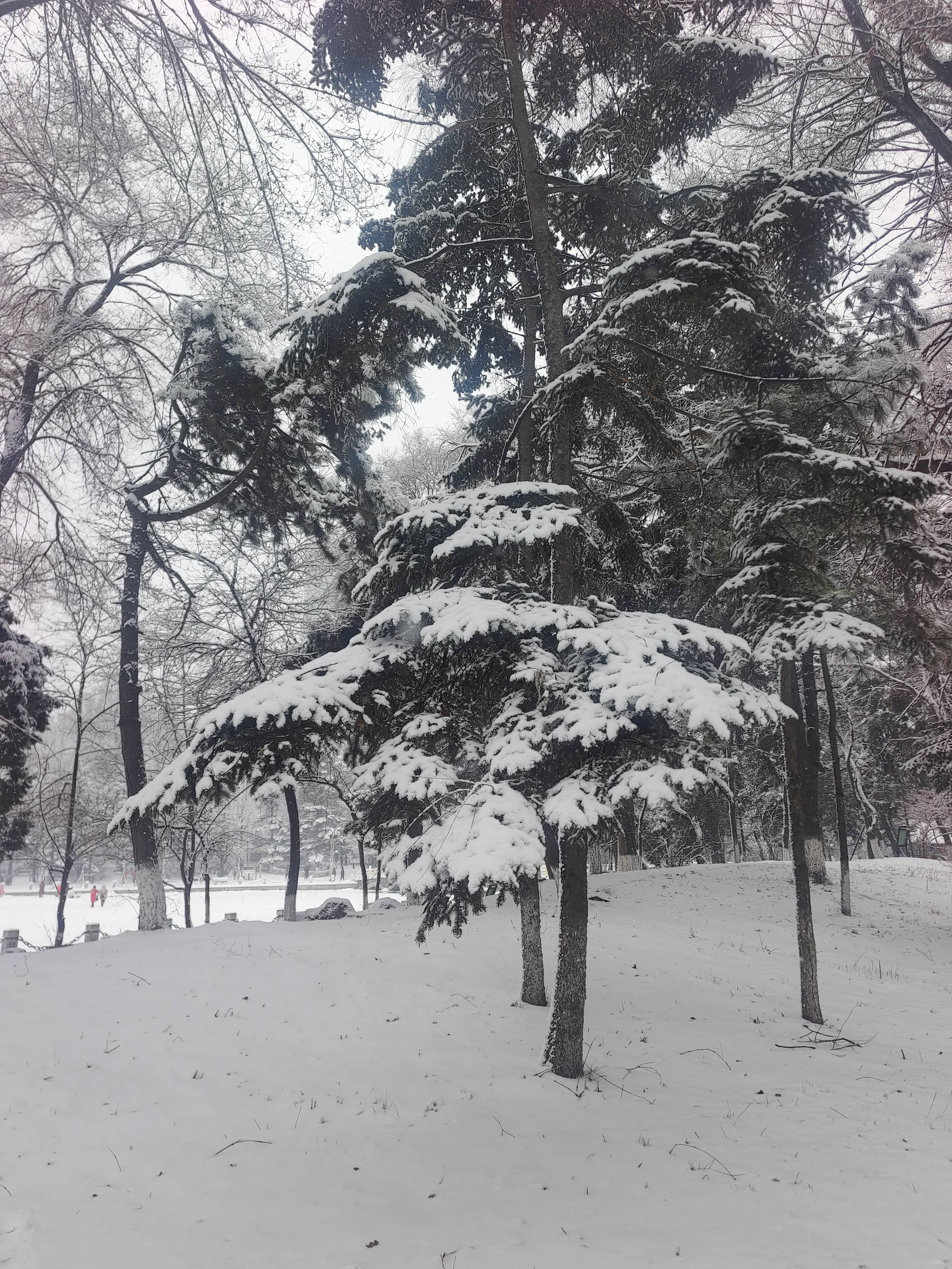 松柏枝叶被雪压弯了腰,好像在低头笑。平日里苍劲挺拔的枝干,被层层积雪裹得沉甸甸,墨绿的针叶间堆满了蓬松的雪絮。那些斜伸的枝桠弯出温柔的弧度,风一吹过,雪粒簌簌掉落,露出底下依旧苍翠的针叶,仿佛是松柏抖落一身雪衣,在对着脚下的雪地偷笑。