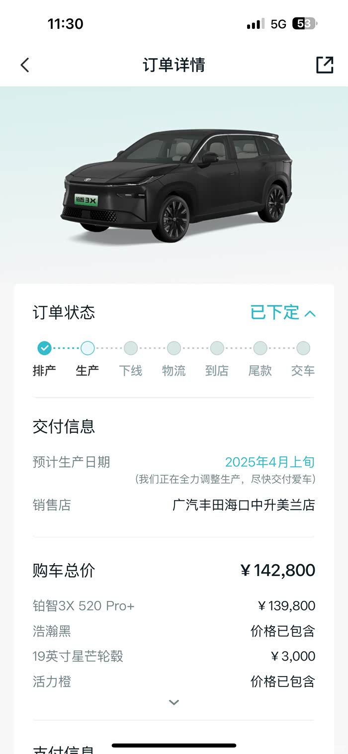 3.19号到4s店进行体验试乘试驾,4s店的工作人员非常周到,预定好到店时间及试驾时间,试驾过程中详细讲解,车子坐着非常的舒适,性能,操控,安全等方面都很满意,当时就下定了铂智3x520Pro➕,app显示4月上旬生产,现在期待爱车中……老铁们,你们下定了吗?什么时候交付爱车?#铂智3X #广汽丰田铂智3X