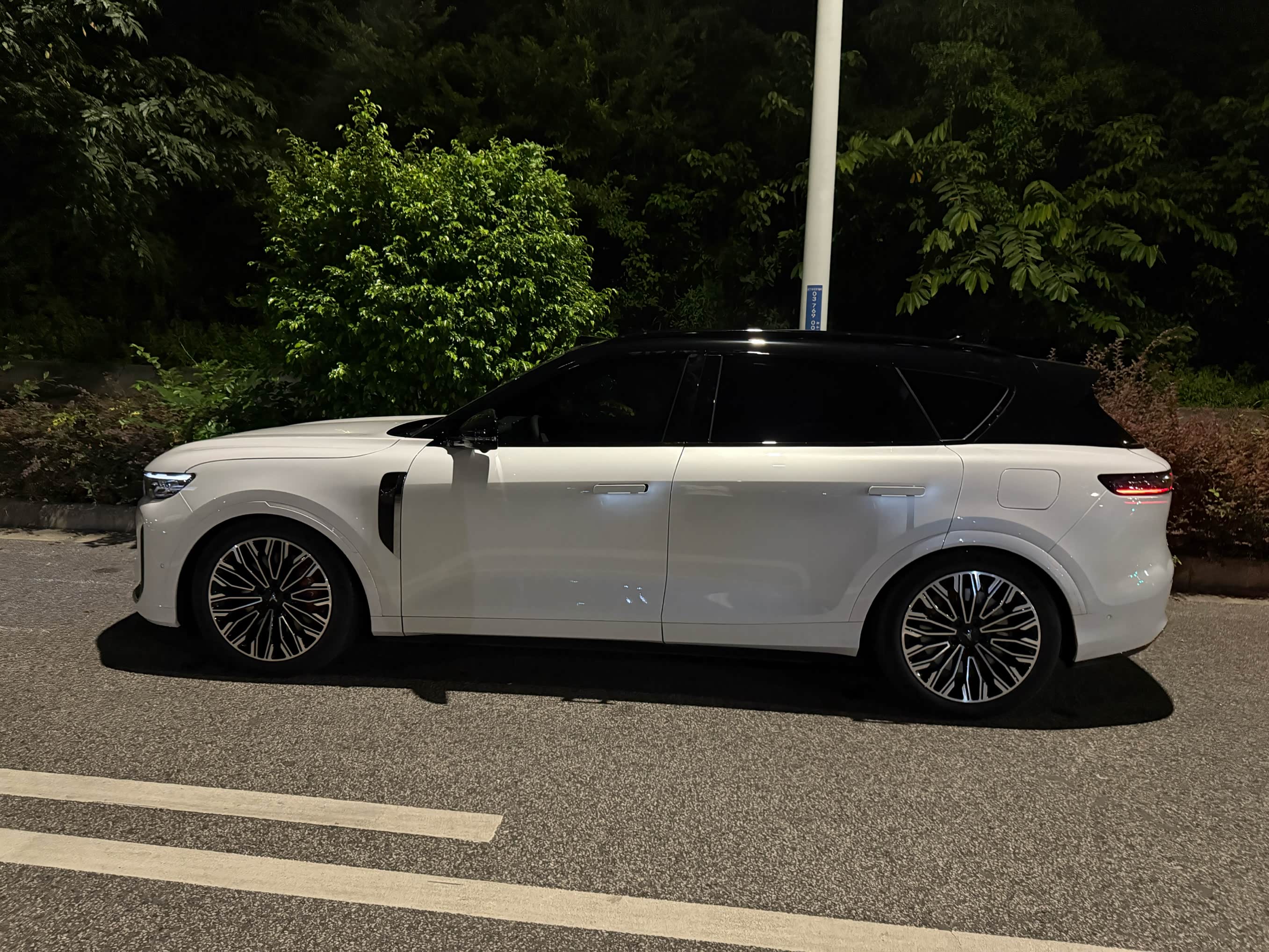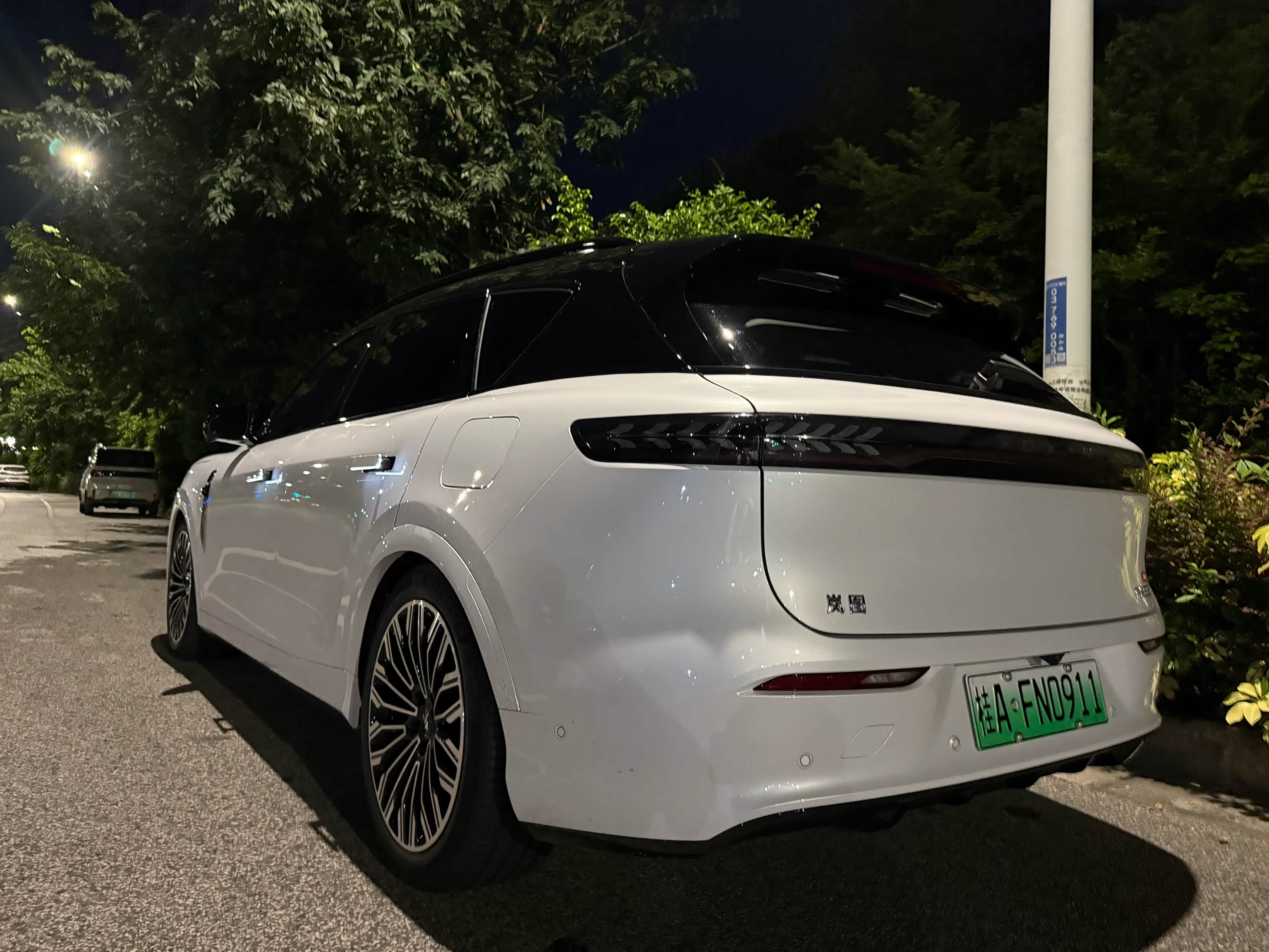 外观侧面跟后面的设计我都是比较满意的!就是前脚这个设计感觉不够高级,我更喜欢老款的前脸,各有所爱爱,看见这停车时候的低趴造型没有,跟猎装车一样!帅!贴完熊猫拼色妥妥的揽胜!哈哈哈
