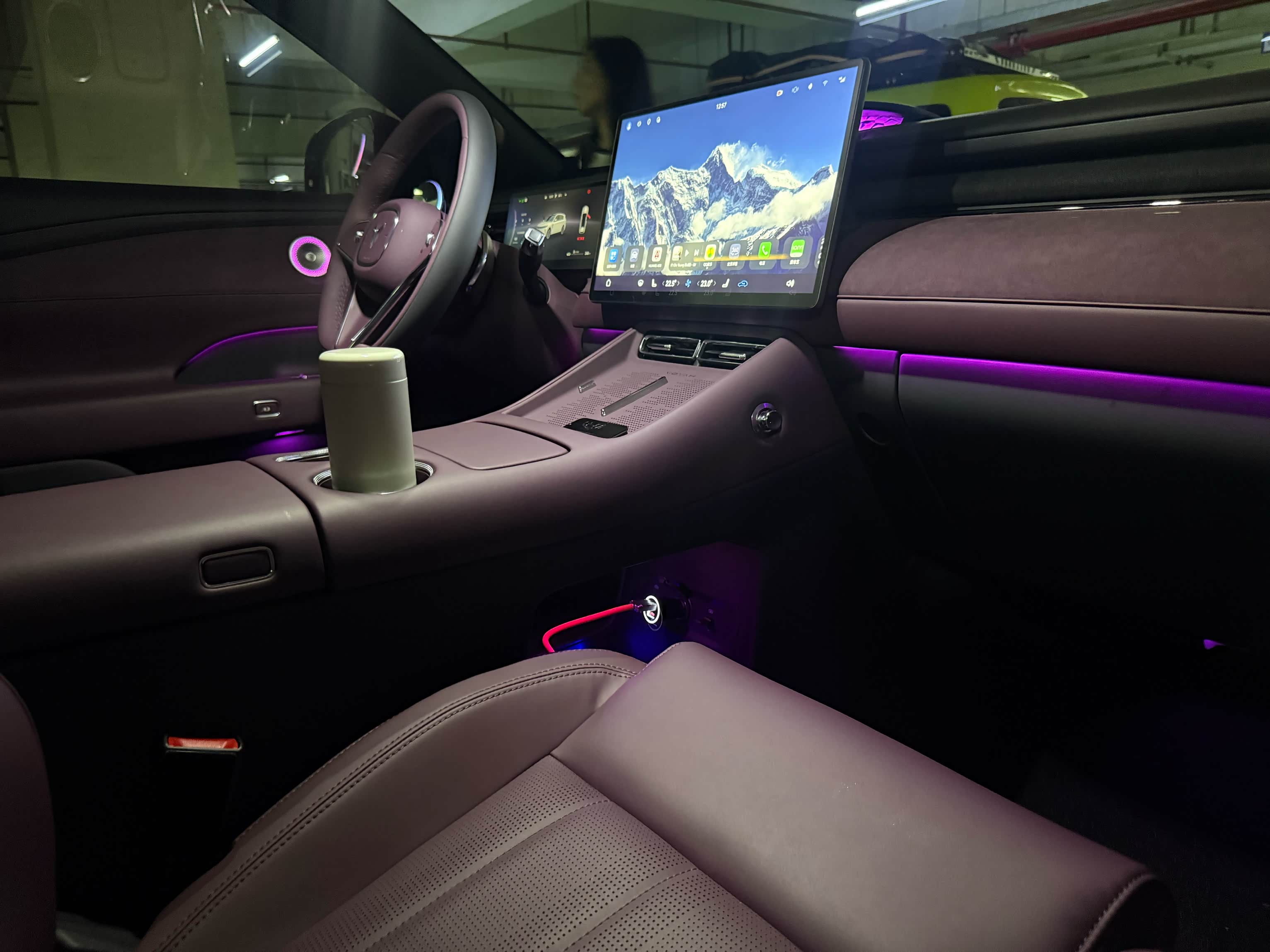 内饰上我还是比较满意的,我选的紫色但是白色显然更高级,更好看!因为我女儿劝退了,白色确实不耐脏,总体来说还是不错的,能摸到的地方基本都是软皮包裹,还有设计了一些挂钩,预留了一些手机支架安装口这点很人性化!我生在广西粉之都怎么样都要预留个挂钩给我挂粉吧,哈哈!
