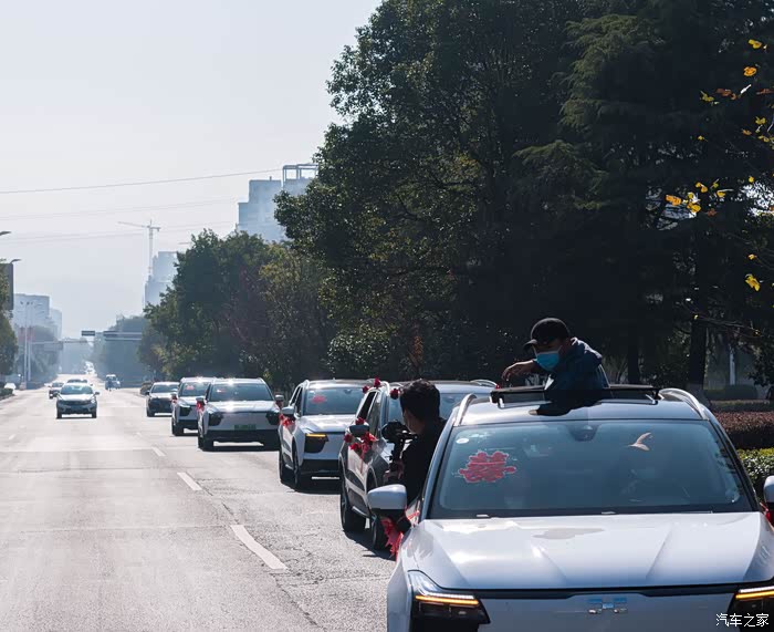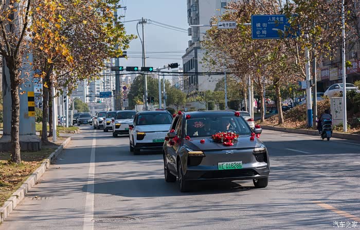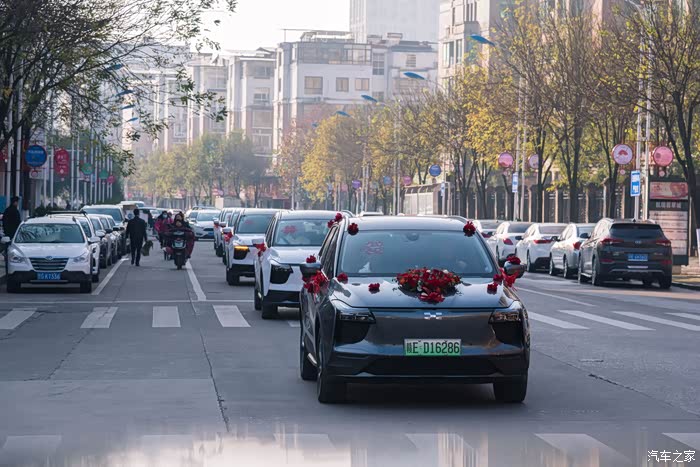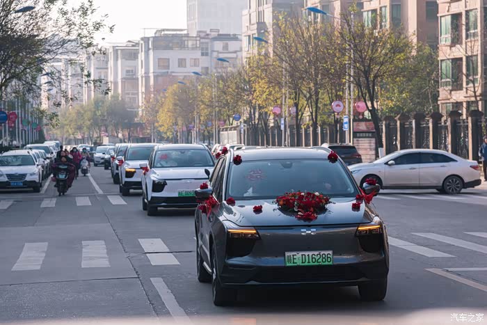 扎上大红花的爱驰U5迎亲车队浩浩荡荡的行驶在路上,一路排开显得格外显眼,引得路人纷纷驻目。