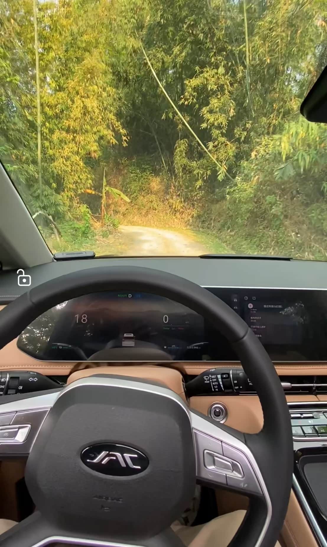 像这种小路,也不怵,瑞风RF8的动力只要加速这种沟沟坎坎的就轻松度过了。极窄的路面就打开全景影像,看得一清二楚。