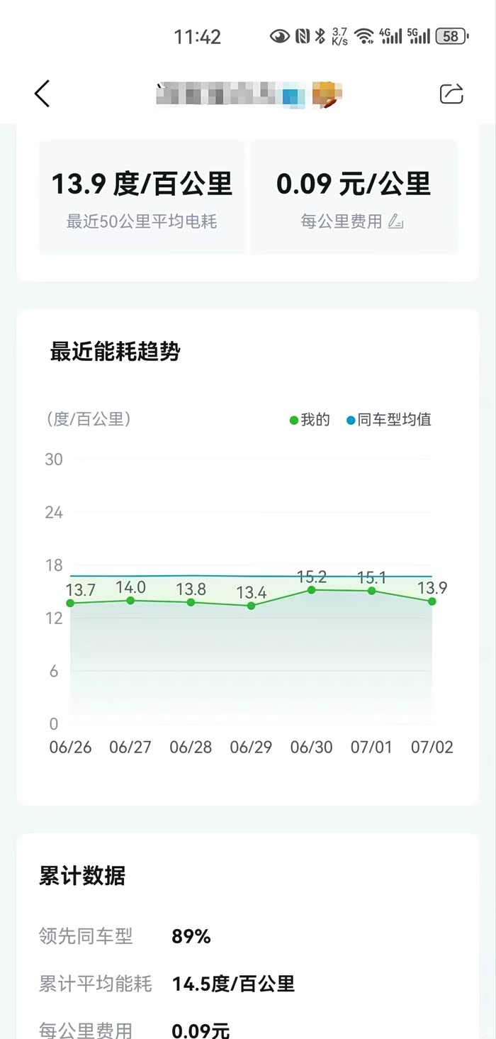 市区续航全程开启经济模式(海狮手册和售后建议2000km后换舒适模式,磨合期),市区续航平均达到14.5度电耗(日常地面通勤-高架),第一次满电行驶了350km,还剩余150km左右里程,第二次满电行驶340km,剩余190km(脚法有进步)