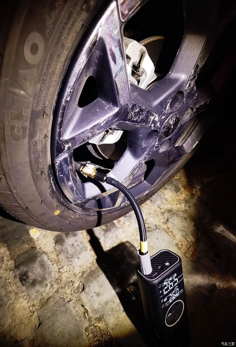 🚙把海洋充气泵的充气管和轮胎充气嘴连接好,再在海洋充气泵上把胎压值设到265KPa(胎压值设高一点可以延长漏气时间,撑到修理店)绕后就可以开始给车胎快速补气了。