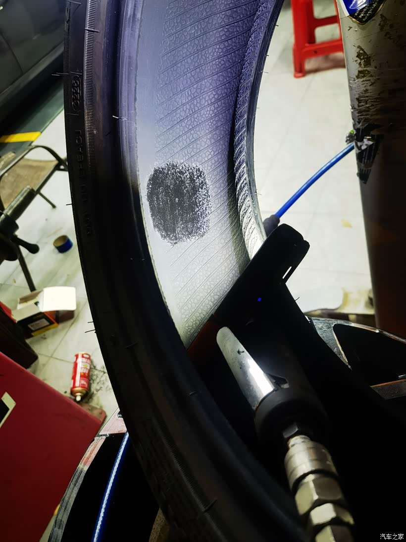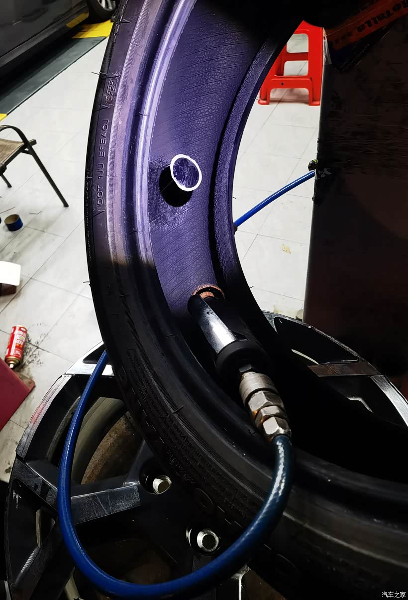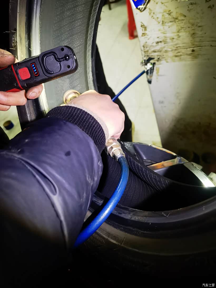 🚙再接着维修师傅开始给轮胎补气,胎压打到250KPa,并安装好轮胎气门芯嘴。