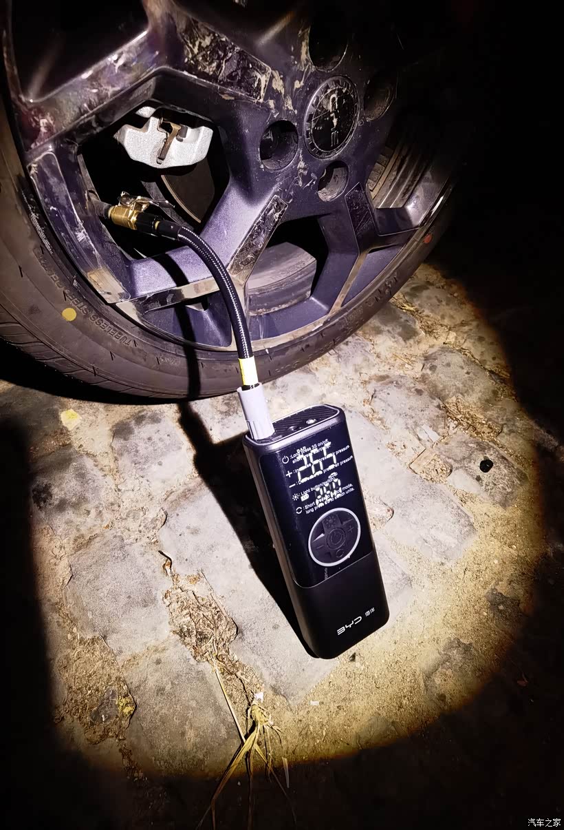 🚙此时海鸥右后轮已经欠压瘪了下来,首先对它进行一下充气补压,才能再开到修理店进行补胎。于是我赶紧从海鸥后备箱下面的储物盒里,拿出我的补胎工具包,里面有我上个月才从比亚迪海洋商城兑换的充气泵,这会正好排上用场了。