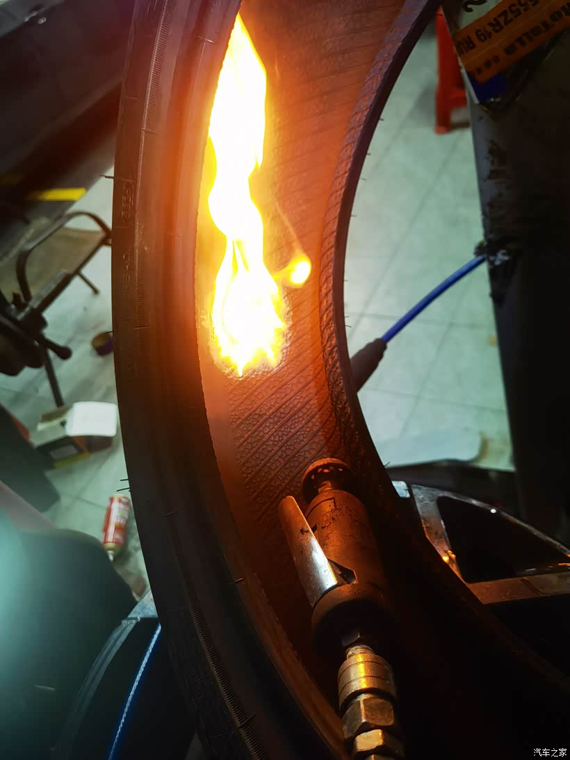 🚙打磨成型之后,师傅在上面涂了一层补胎胶水,接着就用打火机把浇水点燃烧一下。