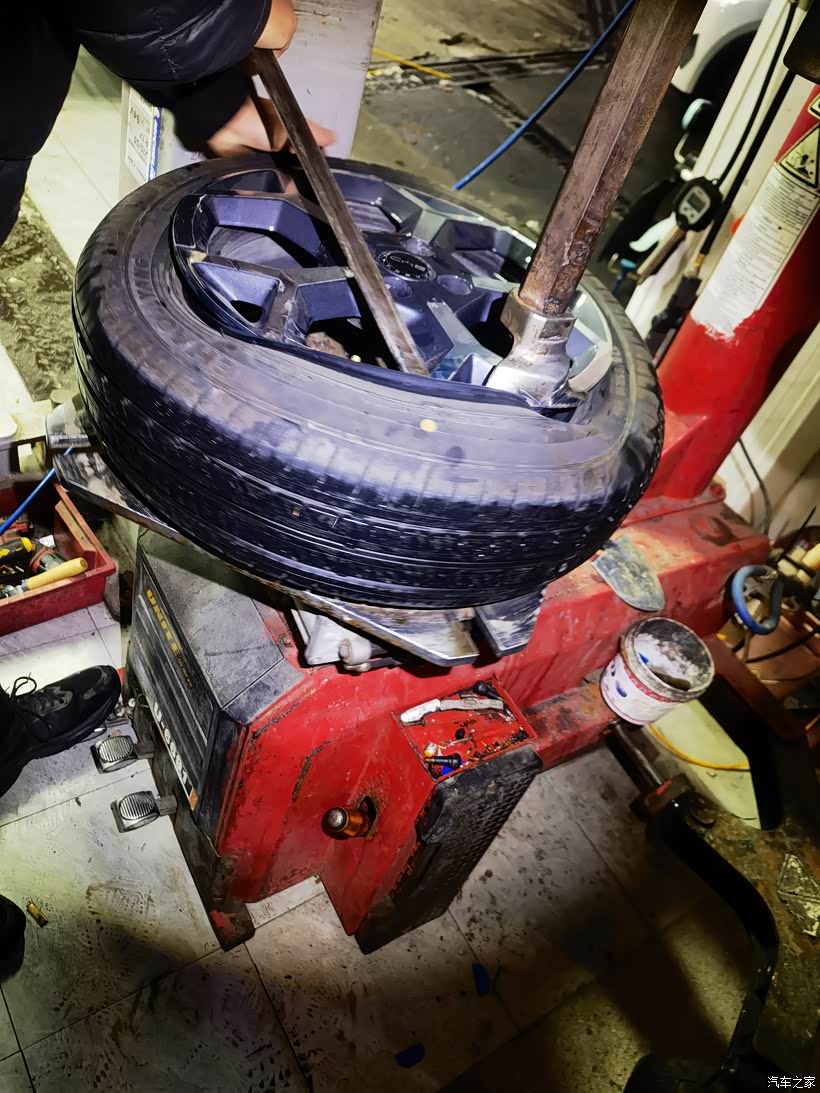 🚙轮胎卸起来之后,维修师傅把轮胎拿到专门卸轮胎的机器上,再配合他手里的撬棒,很快就把轮毂和轮胎分离开了。