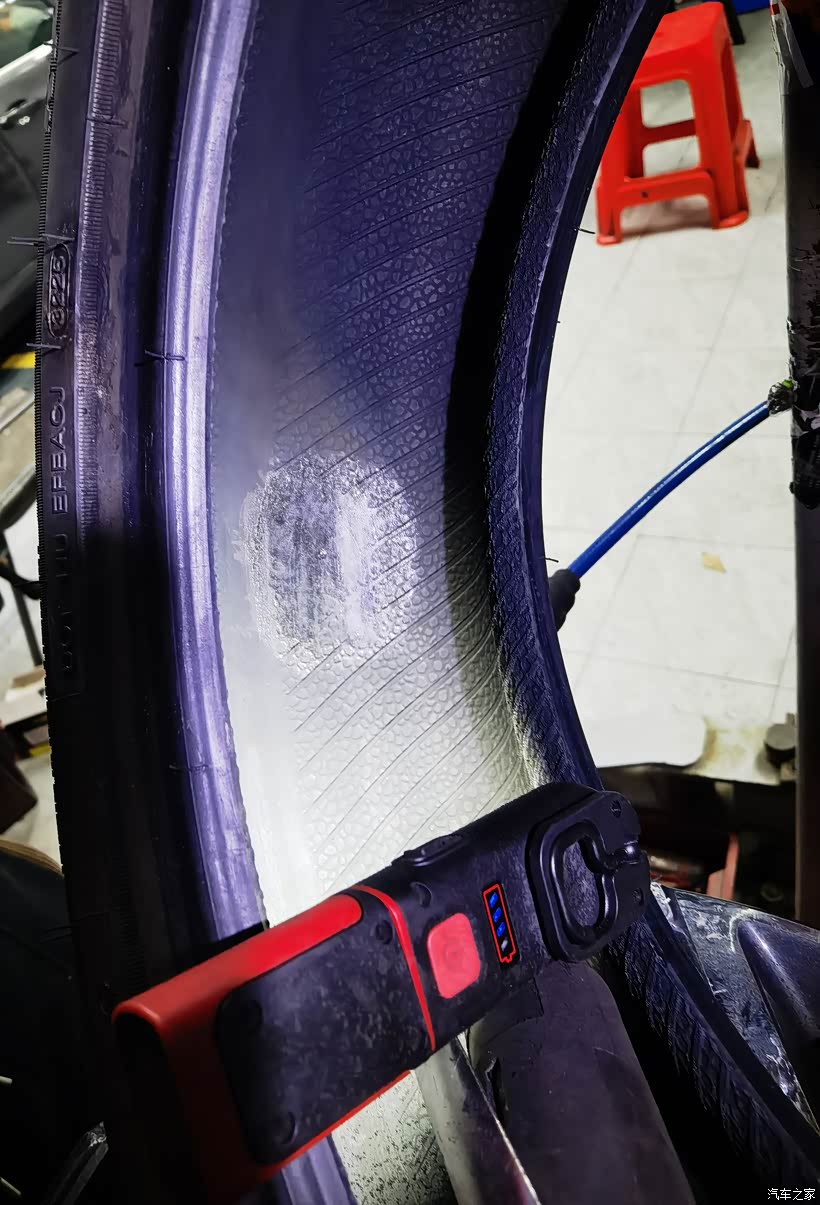 🚙钉子拔出来之后,维修师傅接下来要做的就是用打磨机给轮胎的内壁进行打磨。