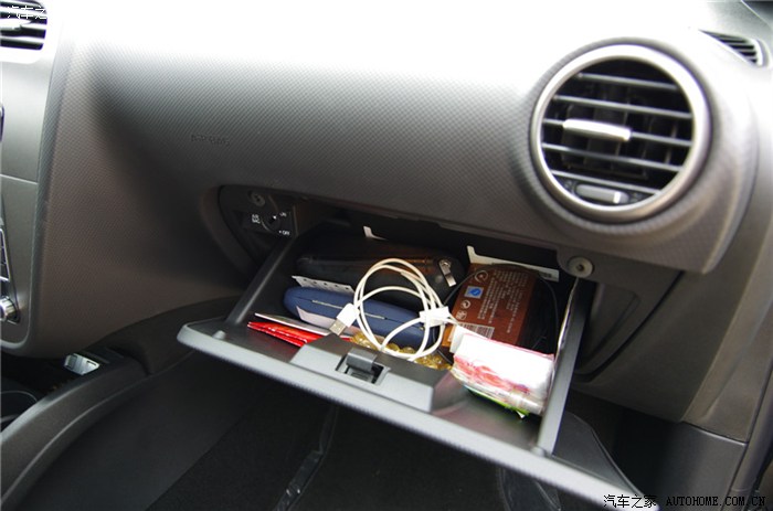 又进入车内,图有点乱啊,呵呵。储物盒有点小,车内放东西的地方本来就不够用,这里面放两个眼镜盒已经差不多满了,看来西班牙人车上不用放东西的啊。