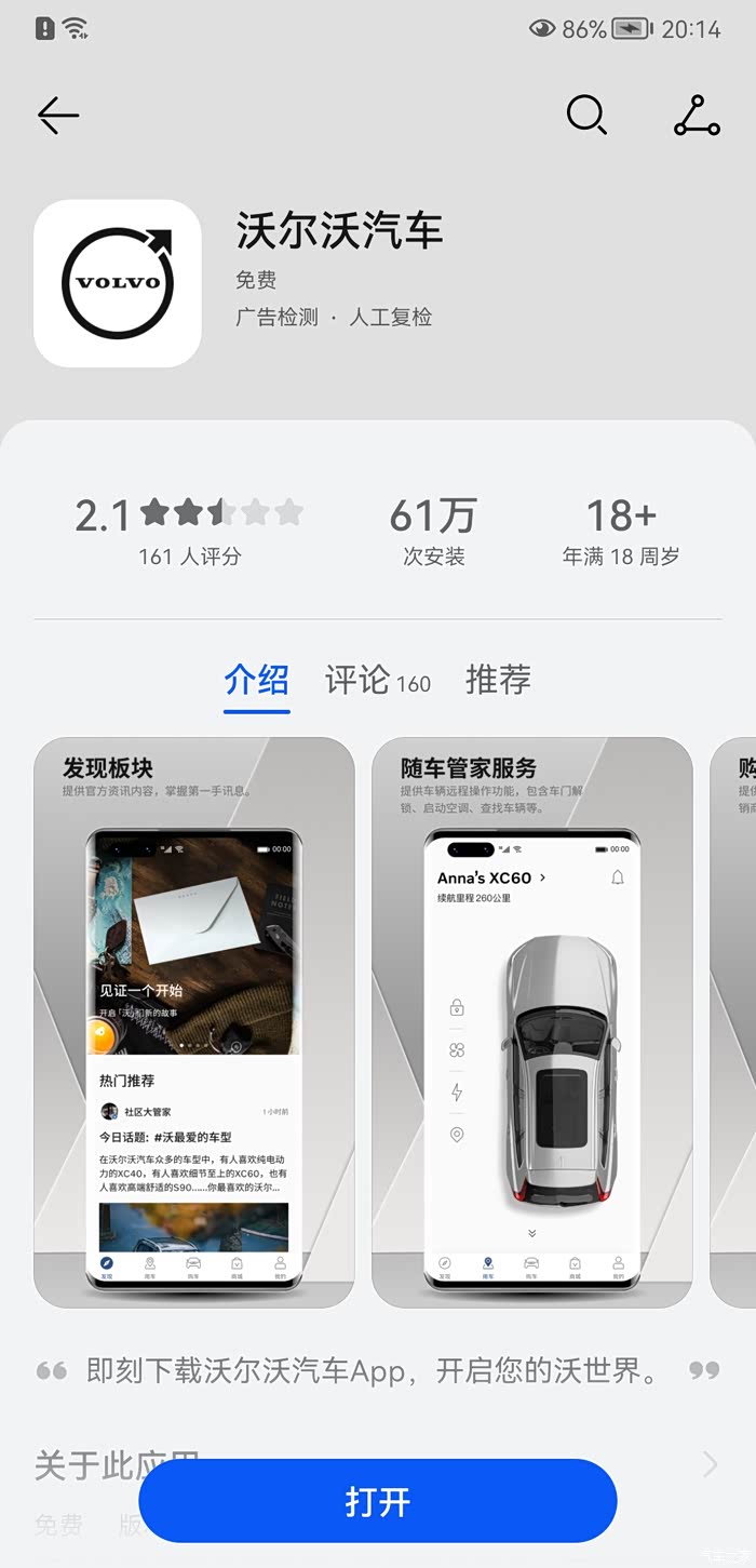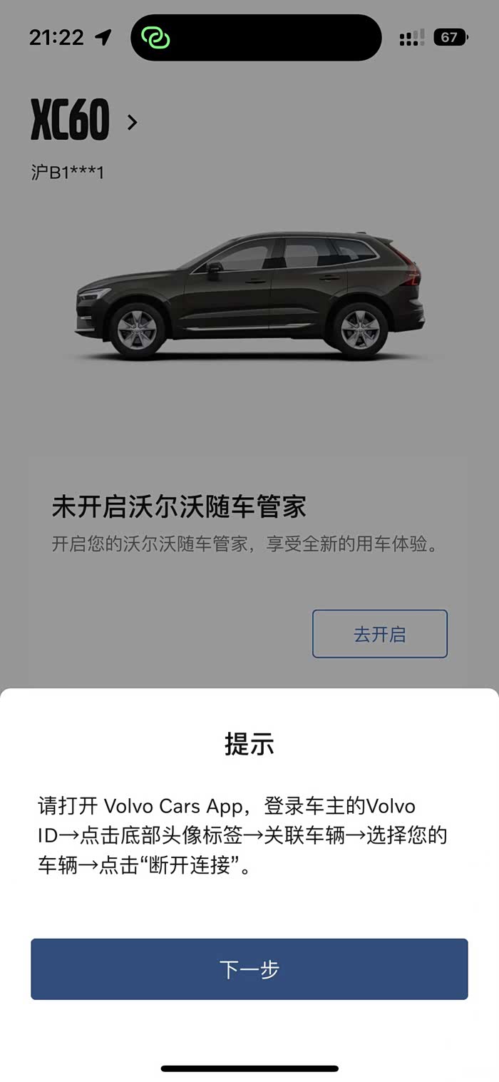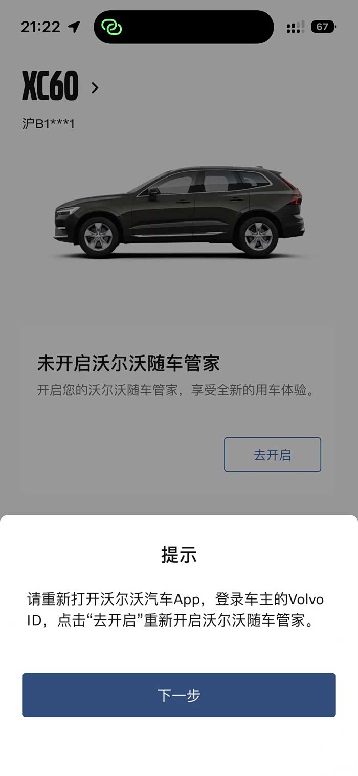 “提示:请重新打开沃尔沃汽车APP,登录车主的Volvo ID,点击去开启重新开启沃尔沃随车管家”