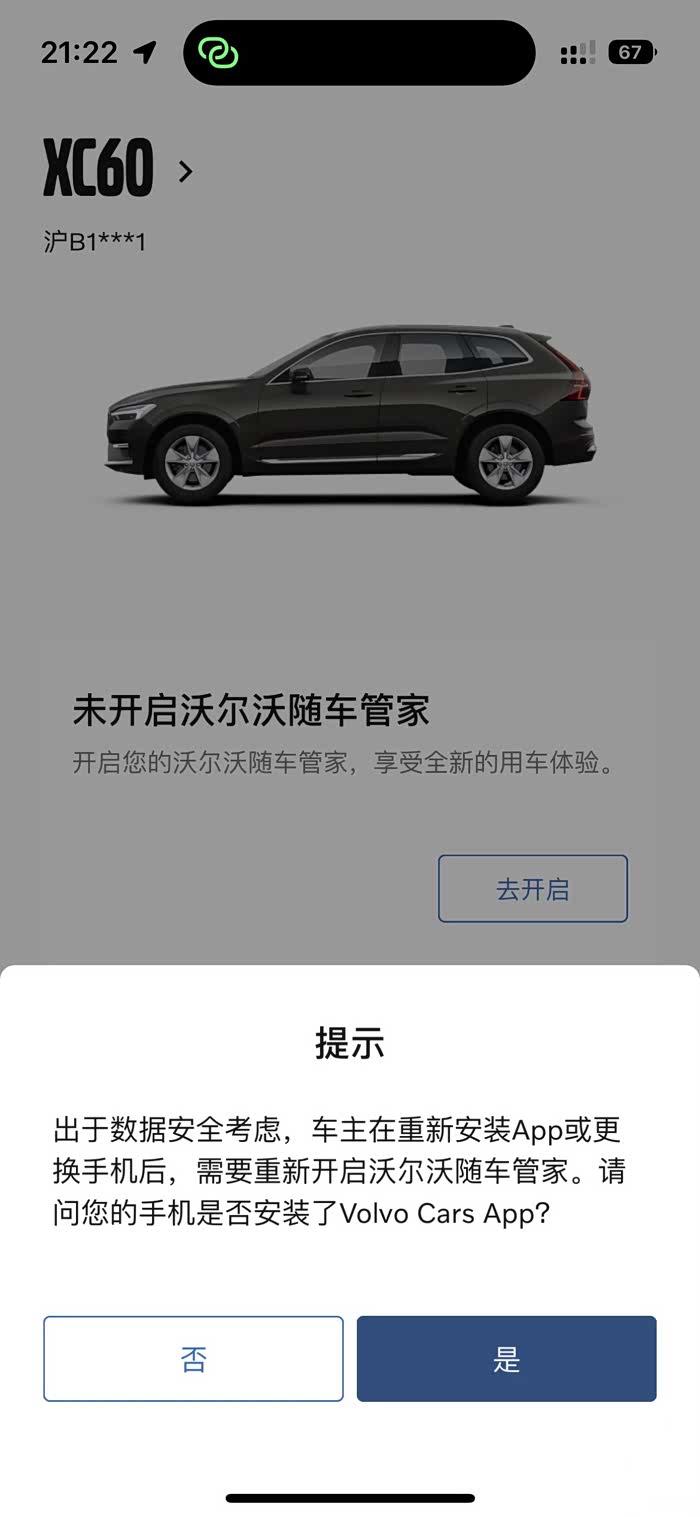“出于安全考虑,车主在重新安装APP或更换手机后,需要重新开启沃尔沃随车管家。请问您的手机是否安装了Volvo Cars APP?”
