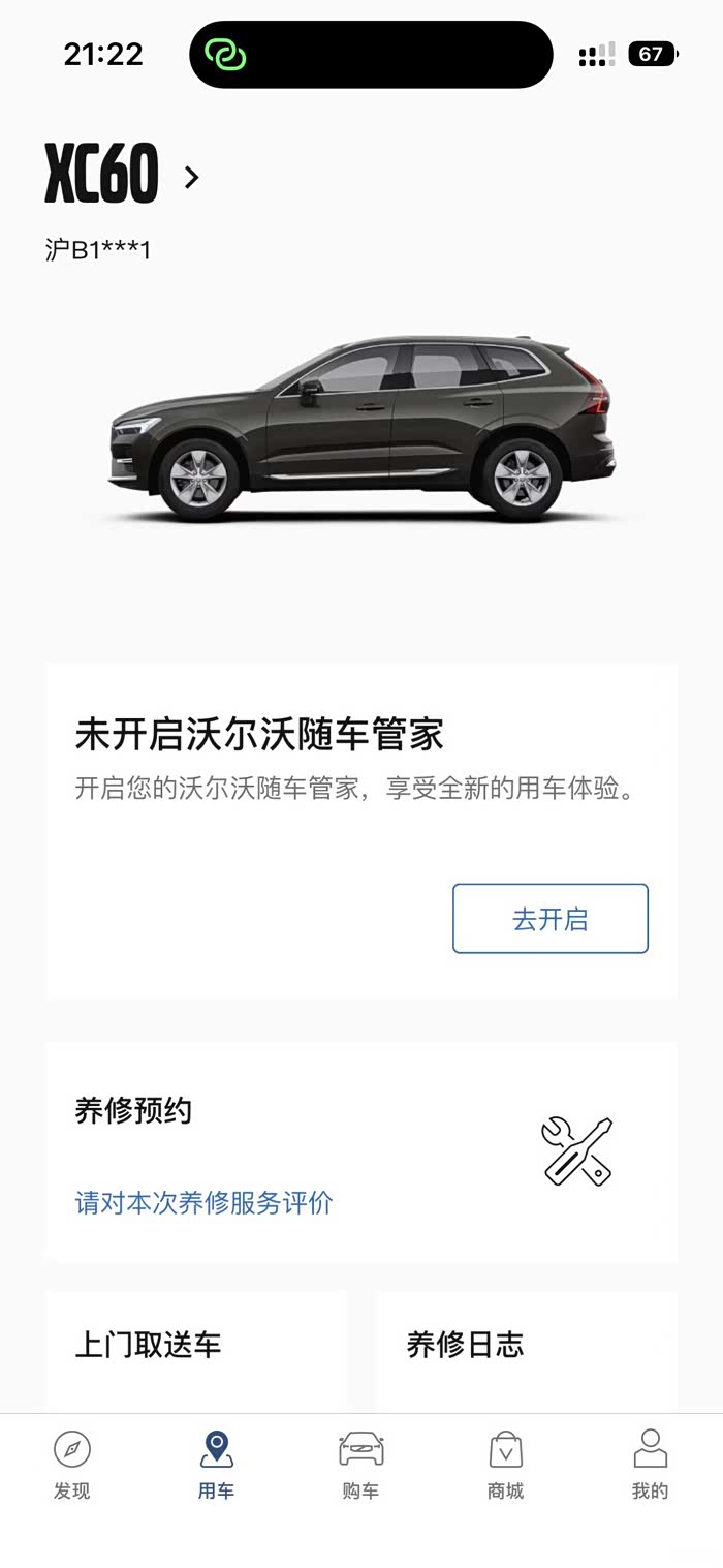 第三步:新手机登录原账号,在用车界面就可以看到车辆信息,如车牌号和车架号,但会显示未开启“沃尔沃随车管家”。
