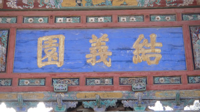 结义木坊。此坊创建于明万历四十八年(公元1620年),正面横匾题“万古纲常”。清乾隆二十七年(公元1762年)解州知州言如泗改额“结义园”。