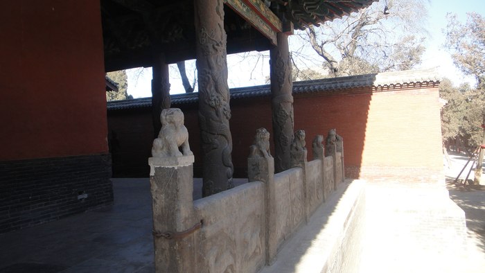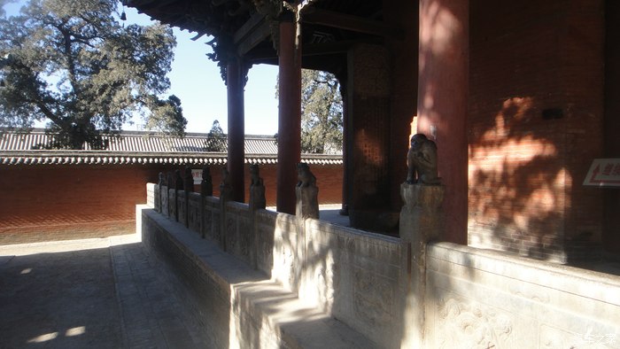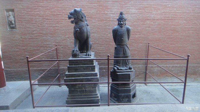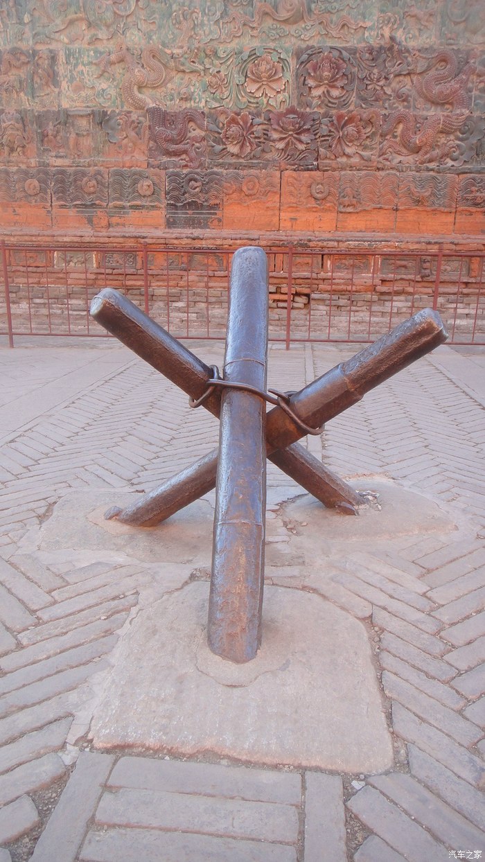 琉璃影璧端门前的这座影壁是明朝宣德年间(公元1426年-1435年)烧制的,门前交叉斜竖着的这三根铁柱,名叫“梐枑”俗称“门档”、“挡众”。它铸造于清雍正五年(公元1727年),提醒人们,到此文官落轿,武官下马,以显示祖庙的威严。端门左右这一对大铁狮系明万历年间作品,高大威猛,面目狰狞,更加重了这种威严的气氛。