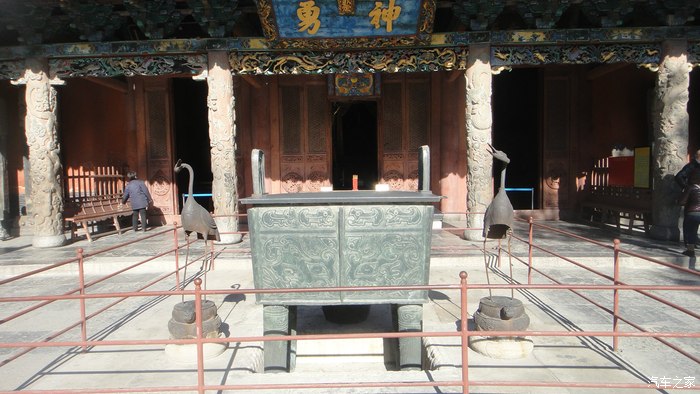 里面不让拍照的,十分严格。。。只能看到关帝像神龛内,关帝身着龙袍,头戴帝冠,腰系玉带,双手抱“圭”,端坐于神龛中。