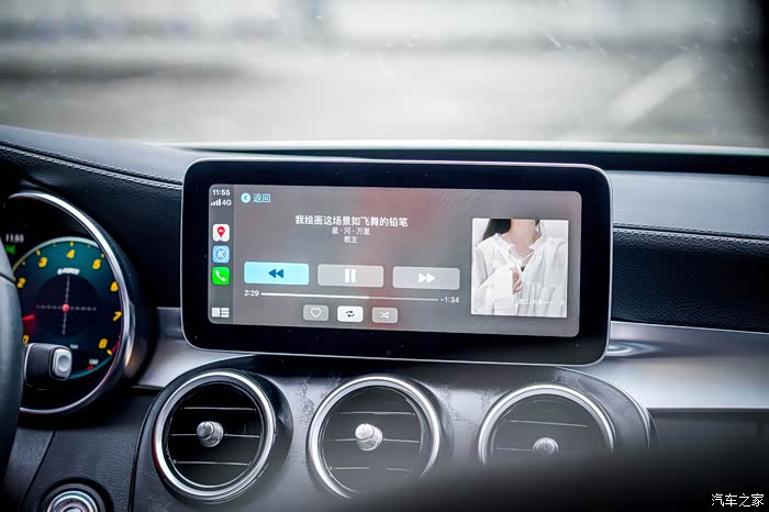 中控这块屏幕加大了尺寸后可比改款前C级的中控屏好看不少,老款的大黑边实在是太宽了点。改款后的这个看这就比较合适,最重要的是支持CarPlay!这可是我的刚需配置!部分新势力车机自带的种种导航还不如给我个CarPlay来得实在