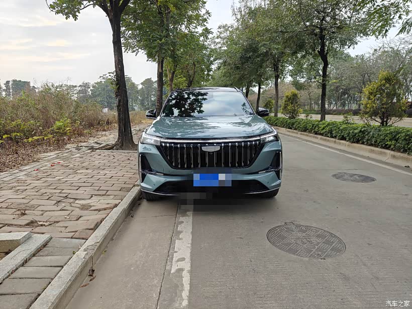 在25年11月份的时候,终于把我的吉利博越L山河版开回家了,选的远山青+黑顶配色,看到实车的瞬间,之前等车的焦虑全散了。低饱和的青绿在阳光下泛着细腻的光泽,搭配熏黑悬浮车顶,比官图里还要耐看。