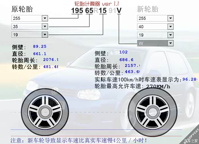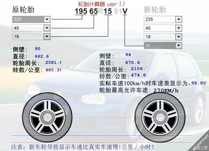 根据您的描述,米工参照轮胎制造商的实践经验进行了计算,建议您所买的轮胎规格首先一定要和原车装配的轮胎规格一致。轮胎规格转换和安装等事宜必须由专业人员进行。