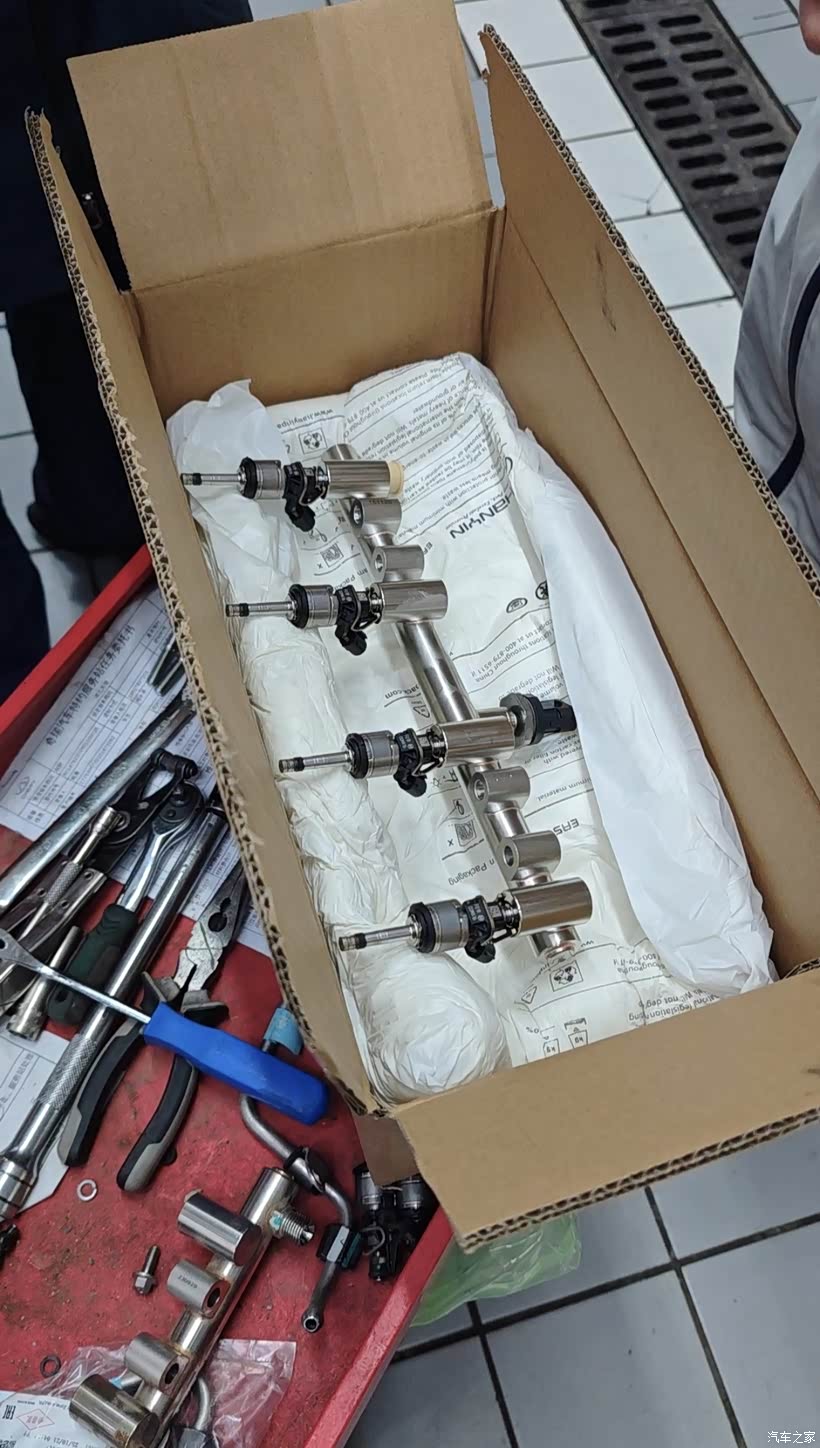 登记完了就上维修工位了,用电脑检查报错故障代码,显示喷油嘴故障,并且点火有一定的延时,发动机舱有轻微汽油味出来。正好店里有现货的喷油嘴总成,就直接给我安排维修更换了。