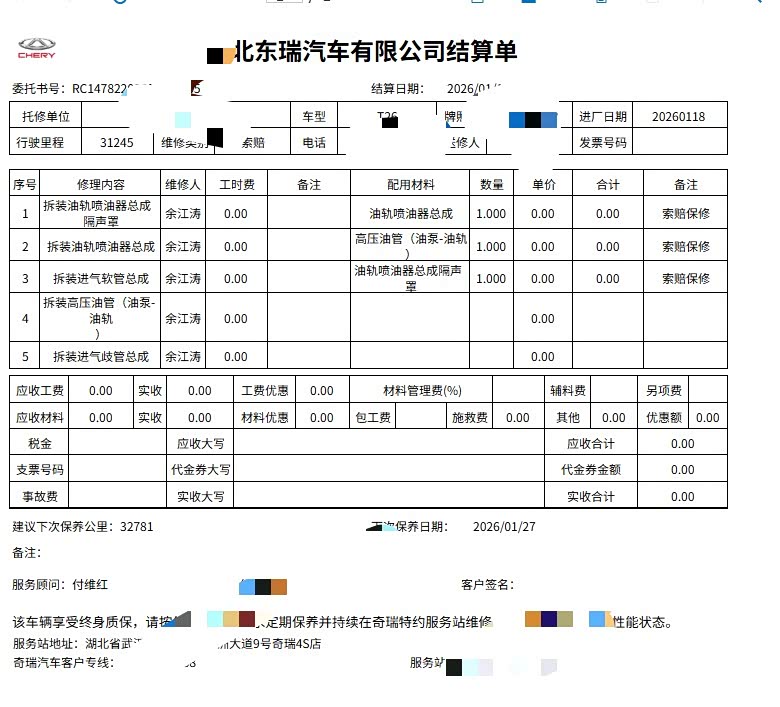 最后附上维修清单,当然是免费的了,这次维修过程很顺利,问题解决的也很及时。