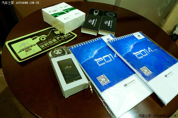 最后,展示一下提车时“真爱经理”送的一堆东西,有斯巴鲁牌小型电动风扇两个,严禁拖车的贴标,熊猫车贴,折叠钥匙样式的U盘,以及XV轮毂的钥匙扣两个,还有2014年的台历两本。记得那天“真爱经理”像圣诞老人一个样,一会儿拿一样给我,逐个的。感谢。
