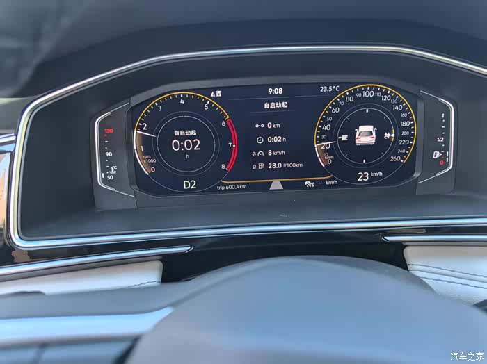 刚刚启车的情况,油耗28个左右。这时油表显示的是已经跑了600KM,且刚刚剩下2格油的情况。