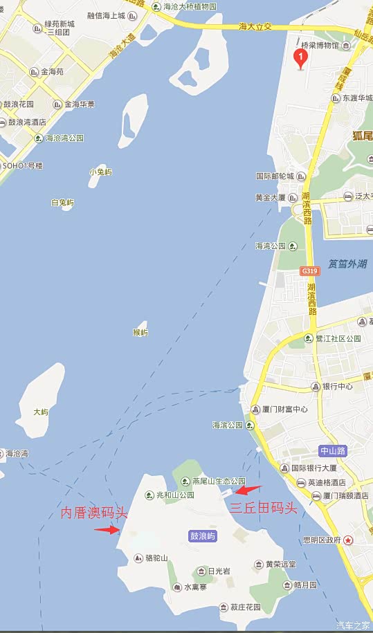 图中1号位置就是东渡码头,在此坐船去鼓浪屿。有两条线路。 1.东渡码头-内厝澳码头 2.东渡码头-三丘田码头。 需要注意的是,不管你是买的那个码头的票,都可以从另外一个码头回。所以如果你逛累了,不需要从原码头坐船哦,可以就近返回厦门。