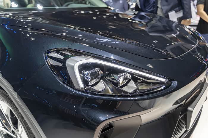 在外观造型部分,几何C延续了几何汽车的“多维流动生命体”的设计理念,其前脸采用官方所称的“驭风下压式”设计,前包围部分配备了主动式进气格栅,可根据车辆行驶速度自动调节开合角度,其有助于减小风阻、提升续航。官方称几何C头灯采用“光棱之刃”设计,其内置了80颗LED灯珠,凸显科技感。