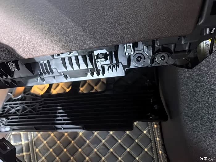 6.拆除手套箱面板下方的横向装饰条后,能看到好几个固定手套箱的螺丝,拆下螺丝。