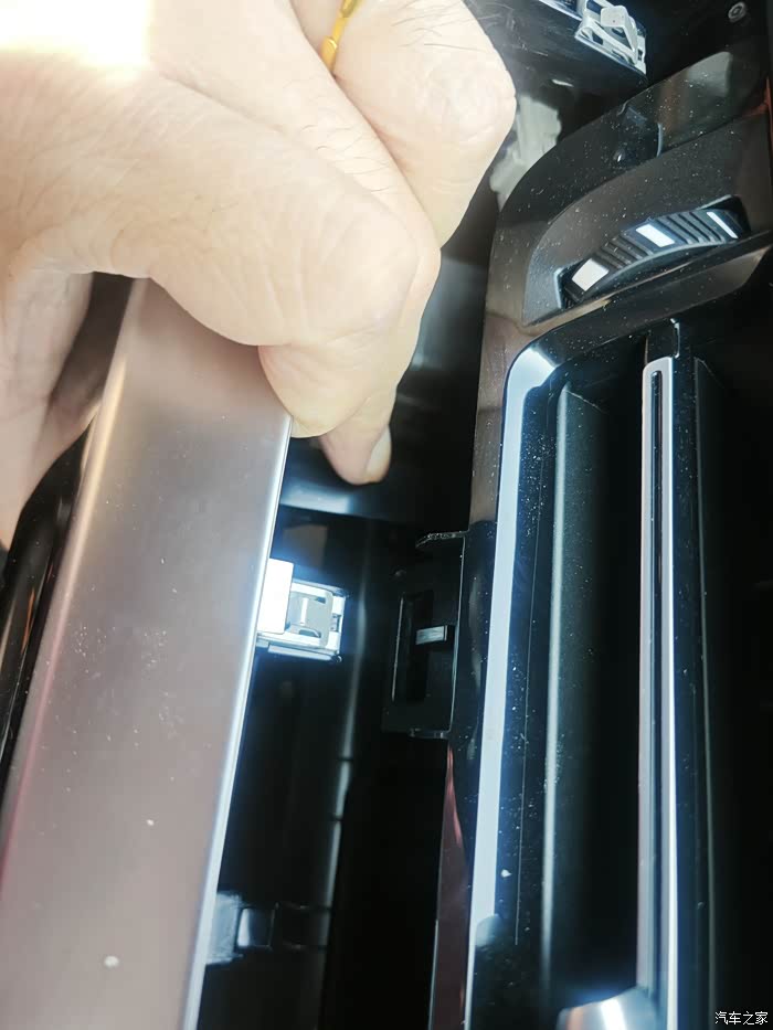 5.拆除手套箱面板下面的横向装饰条:装饰条底部有两个螺丝需要拆掉,要不然无法拆下这个横向装饰条,这也是打开脚窝灯面板的目的。