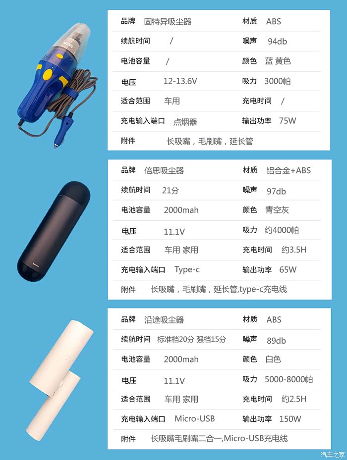现在越来越多的家庭都有私家车,但很多车主不知道如何去选择一款好用的车载吸尘器。首先我们要了解一下车载吸尘器的工作原理。车载吸尘器的风机叶轮在电动机高速驱动下,将叶轮中的空气高速排出风机,同时使吸尘部分内空气不断地补充进风机。这样就与外界形成较高的压差。吸嘴的尘埃、脏物随空气被吸入吸尘部分,并经过滤器过滤,将尘埃、脏物收集在尘筒内。今天家家众测达人鹏言为大家挑选了3款车载吸尘器来做一个横评,这三款吸尘器分别为:1.固特异吸尘器2.倍思吸尘器3.沿途吸尘器,我将会通过外观,握感,吸力大小等方面进行对比,希望能给众多车主们起到一个参考。