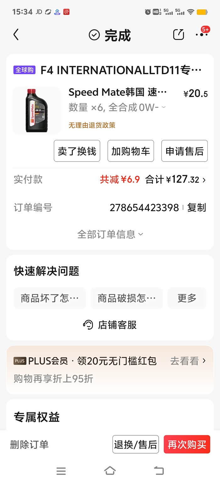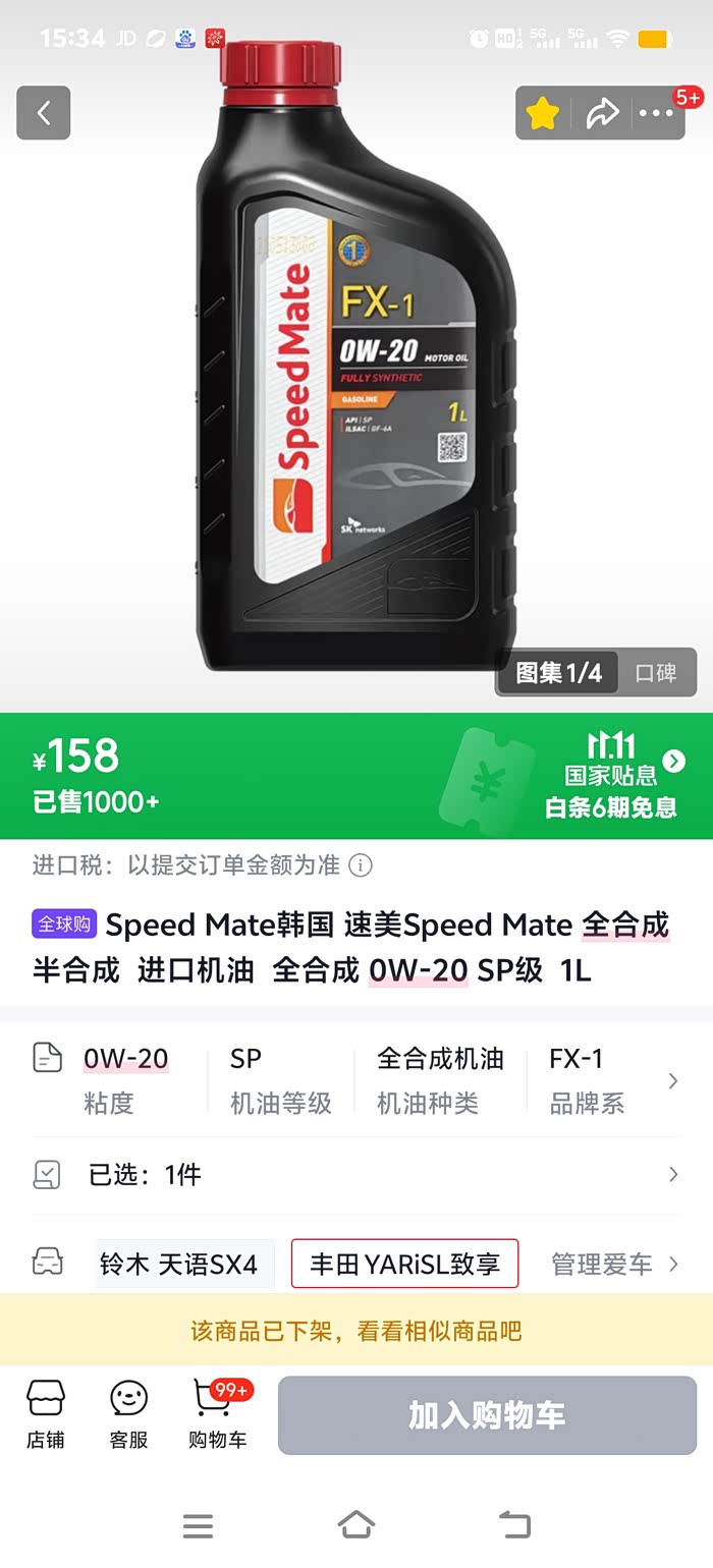 韩国速美机油,0W20,20米一升,买了6瓶,正好保养两次,加上关税127大洋,现在没活动了