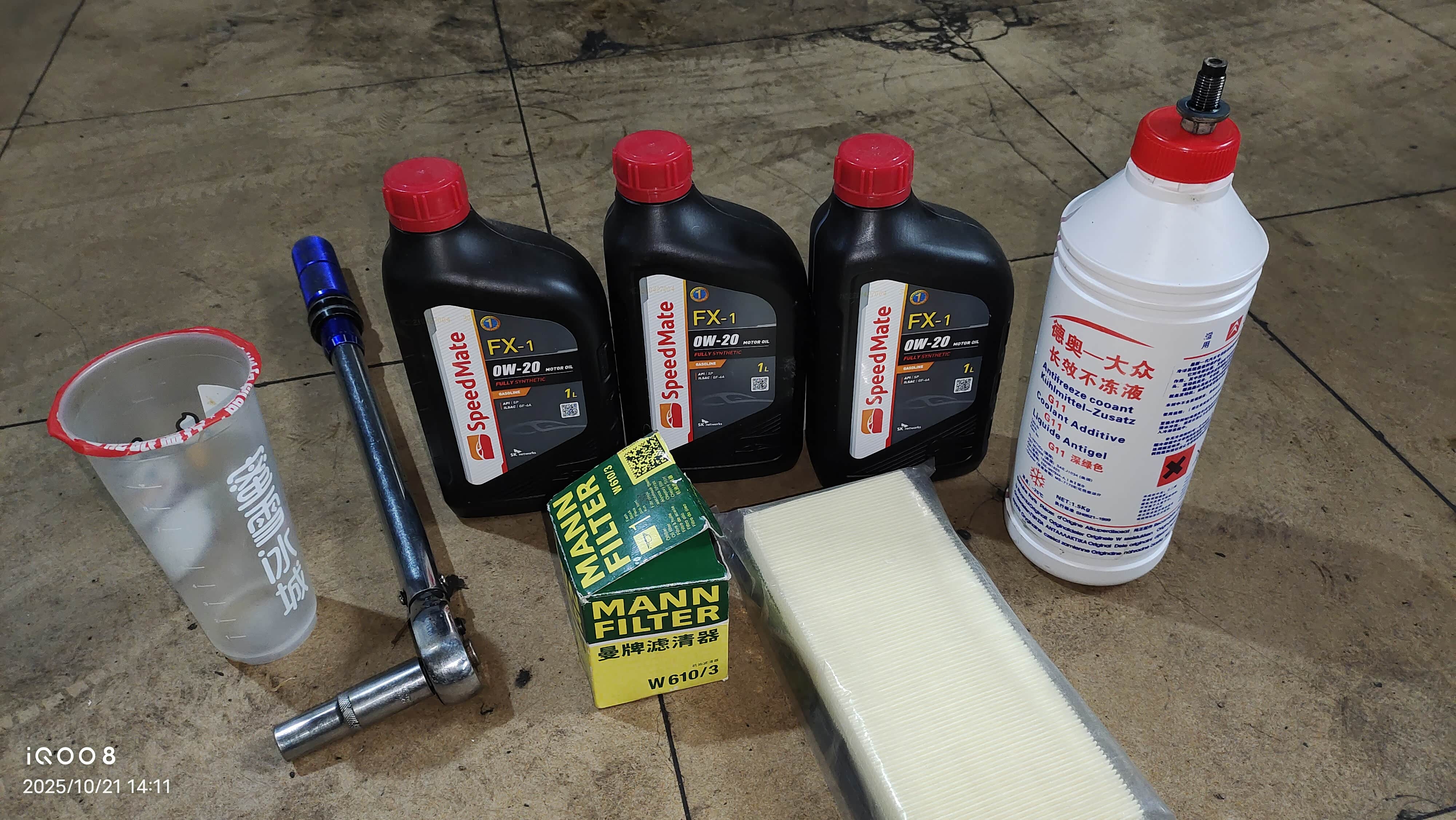韩国棒子的水油,20米一升,空气滤芯,曼牌机滤,还有换机油神器,蜜雪冰城杯子