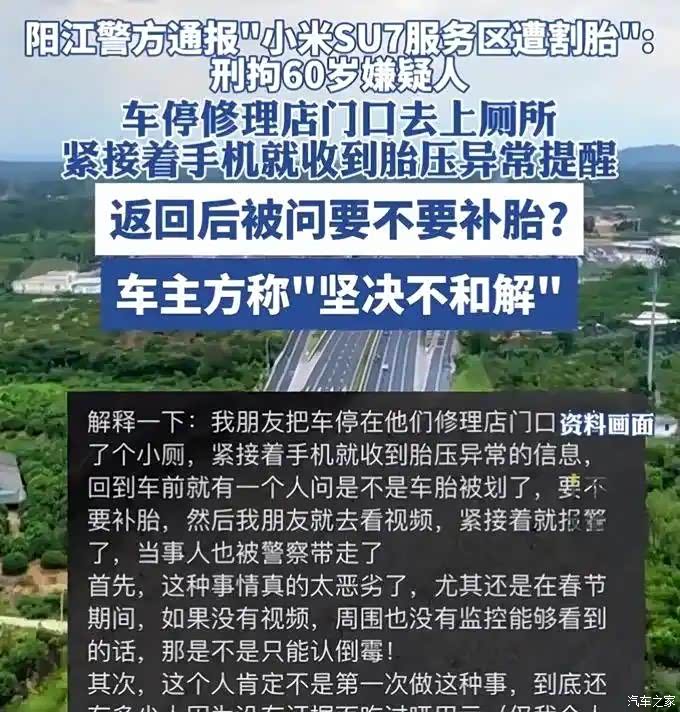 最近广东阳江新墟服务区的“划胎门”事件冲上热搜,一辆小米SU7车主在服务区停车上厕所的间隙,轮胎被汽修厂员工王某用利器划破,随后还被“贴心”询问是否需要补胎。嫌疑人虽已被刑拘,但背后暴露的服务区管理漏洞和潜在风险,让无数车主后背发凉。作为常年跑高速的“老司机”,今天必须和大家掰扯清楚:服务区到底有没有责任?车主又该如何自保?