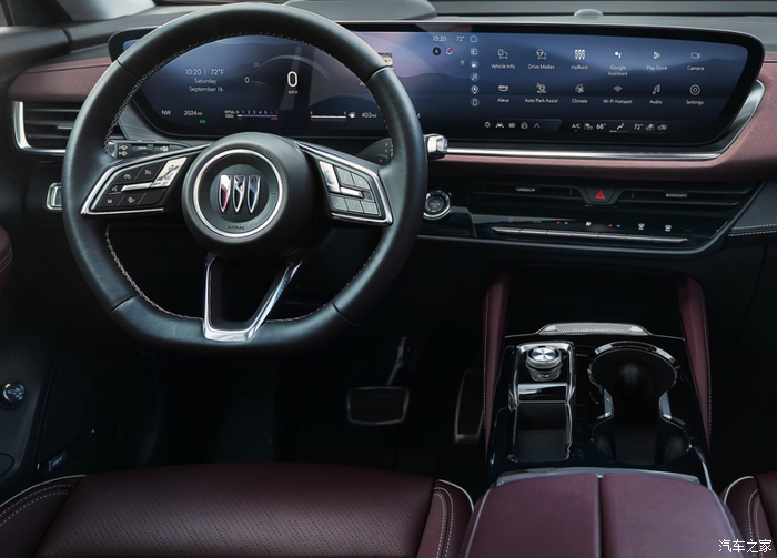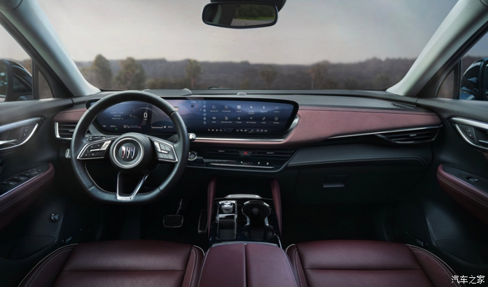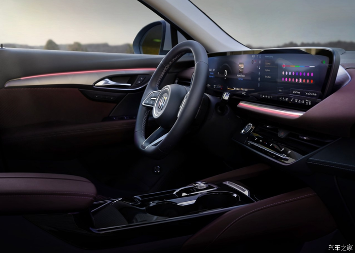 进入车内,映入眼帘的是别克家族最新的环抱式座舱,大尺寸的双联屏科技感满满,屏幕下方依旧保留了空调控制面板,内饰主要通过皮革、镀铬、钢琴烤漆面板灯多种元素进行修饰,坐进车内就能感受到强烈的档次感。
