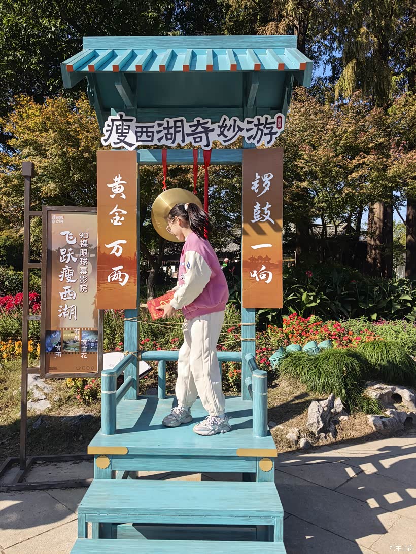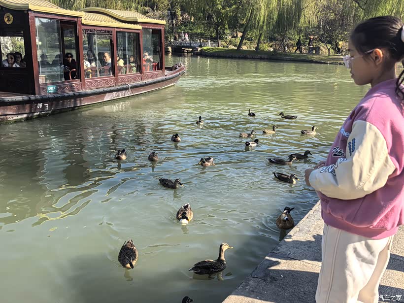 今天的安排是瘦西湖、宋夹城、大明寺。昨天走东关街,今天换个方向,从彩衣街逛到瘦西湖。其实路程不远,一路闲逛很快就到了。瘦西湖是需要门票的,每人60,1.4米以下的娃免票。我们从南门坐船直接到了二十四桥,然后在里面慢慢逛。在公园里喂鸭子、喂天鹅,打卡盖章,娃玩的不亦乐乎。