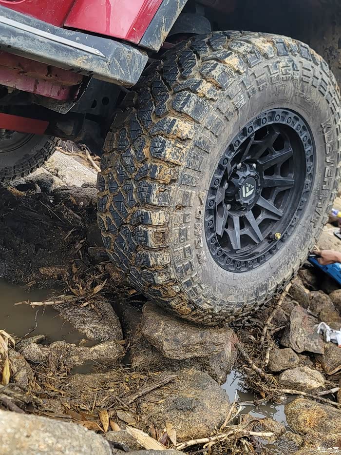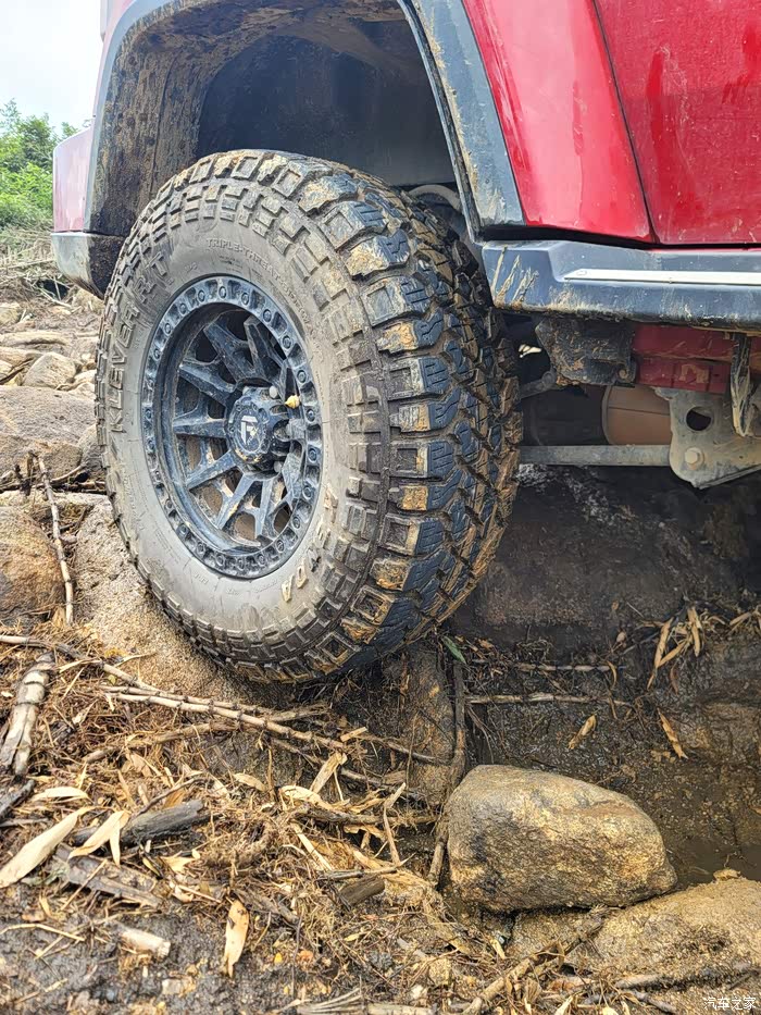 就在卡住的瞬间,我意识到可能是后桥顶住,因为是下坡,只要能后退,后桥就能往上提,问题就不大,我挂上了后锁 低四,四个轮子都冒白烟了,车子还是在原地,并不是车子动力不够,下车仔细看才看见是后桥的一个支架卡主在石头缝隙里无法后退,加上前轮附着力太小使不上力,后来我再次尝试,加上左右打方向,后退,依然是无动于衷,所以只能自己救援了。