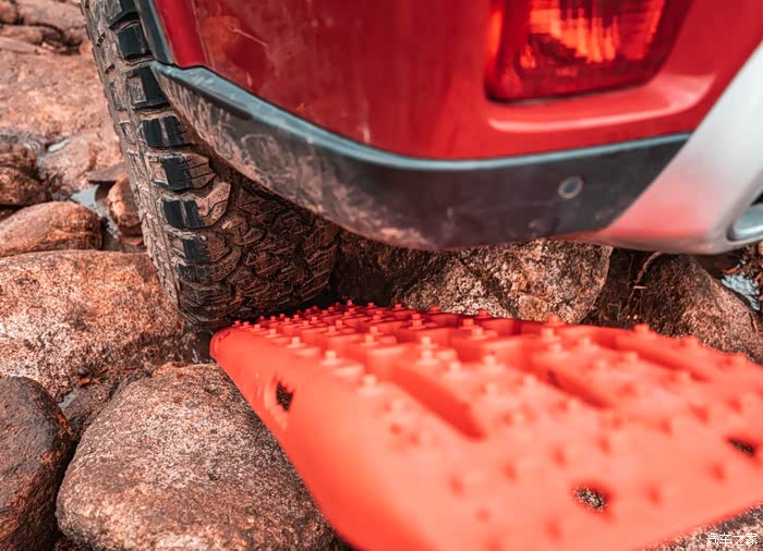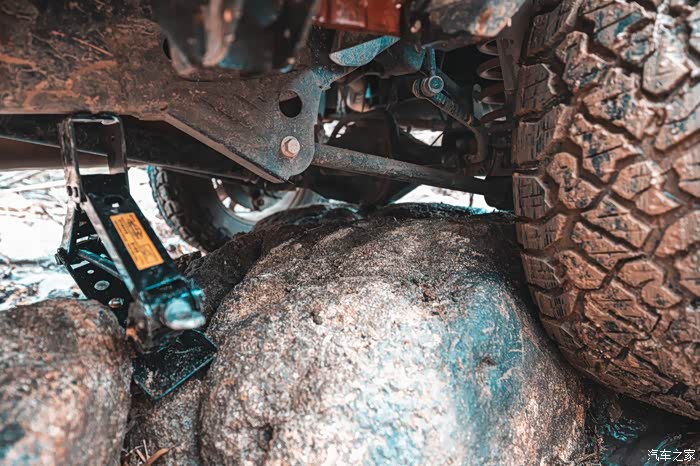 第一想到的方案就是,先用千斤顶把左后轮卡住的轮子顶起来放入脱困板与石头,先让卡主的支架离开石头。