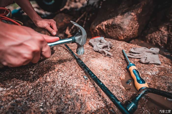 于是乎,我拿出了锤子与钢钉开始砸石头,试图把这块突出来的石头给砸碎,这样后桥突出的支架就不会卡在里面,或许可以出来