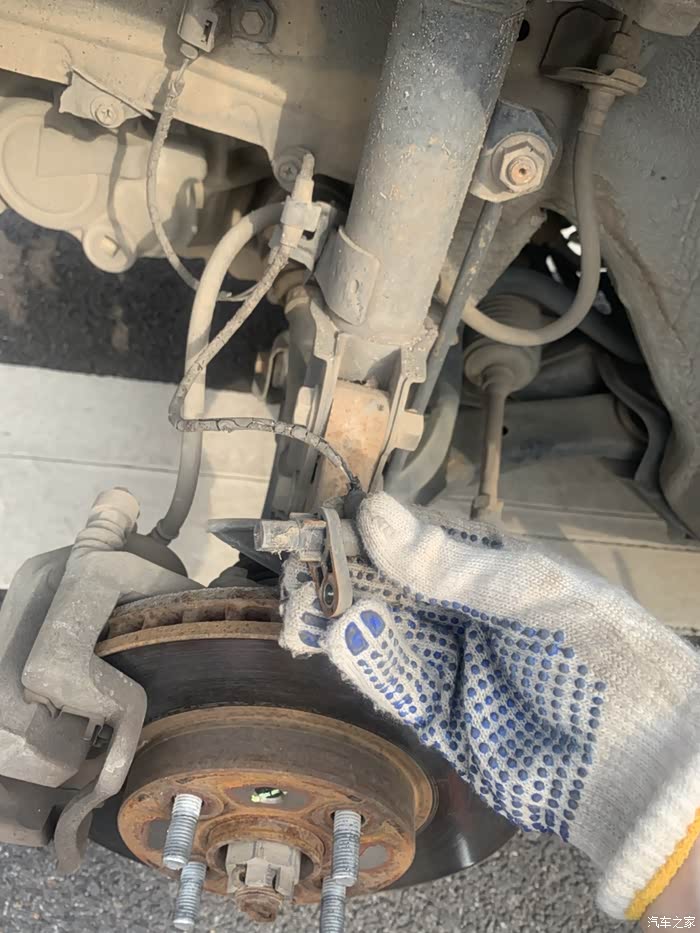 卸下车轮、卸开内衬叶子板,传感器线束接头在叶子板里面,撬开固定卡扣,把旧的传感器卡扣全部撬开,卸掉,拿掉坏件,装上新的传感器,把卡扣和固定位置装到位,这是传感器装在车轮上得位置,装好,启动,故障灯消失,溜一圈看看故障灯亮不亮,不亮就是弄好了