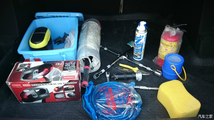 这个是后备箱的常用小工具了,储物盒,洗车的小拖把,雨敌,雨天放雨伞的小桶,洗车的海绵,拖车绳,换轮胎的十字扳手,电动充气泵!平时小拖把、拖车绳放在备胎的位置,不占空间!