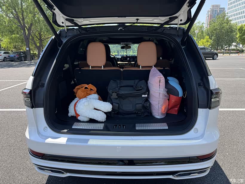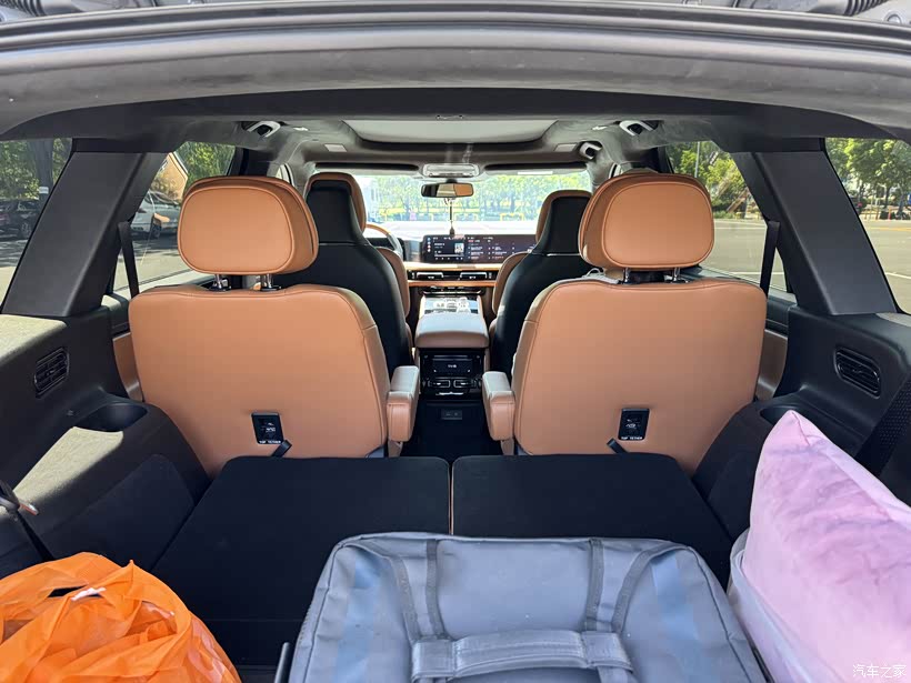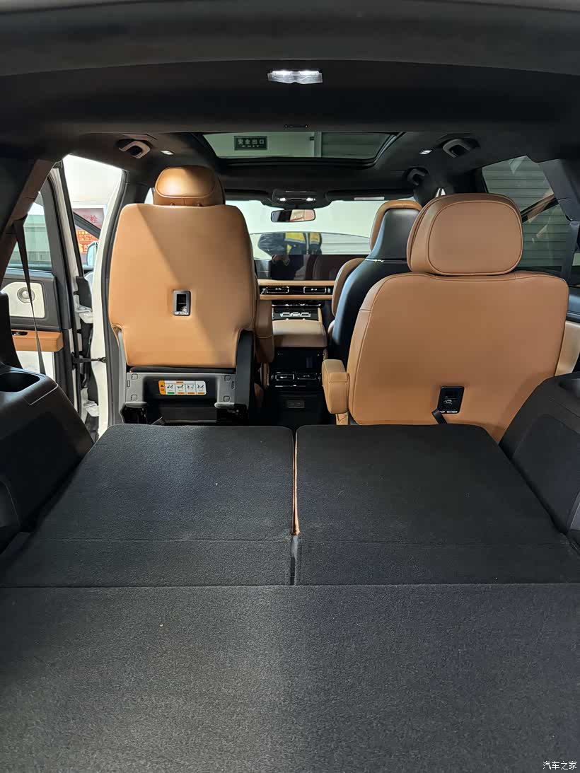 超大的外部尺寸也带来了巨大的内部空间,前两排的座椅空间几乎达到了空间自由的程度,第三排的横向空间也很大,把第二排座椅调到与第一排座椅剩一拳多的位置,第三排坐身高1米65及以下的乘客完全没问题,坐再高一点的跑个短途或者应个急也可以。在第三排座椅立起来的情况下,行李箱储物空间达到415升,在同级别油车应该也算第一。总统版的Sanctuary皮质座椅采用北美最顶级的纯天然非压花半苯胺高级皮质,坐着感觉软硬适中,座椅有很好的承托性,很舒服。第一次开长途,因堵车500公里跑了8小时,也没有腰酸背痛的疲劳感觉。第二排中间通道宽敞,孩子能自由穿梭在第二排和第三排之间。第二排座椅放到最仰的角度,把头枕包裹好头部,能让你迅速入睡。