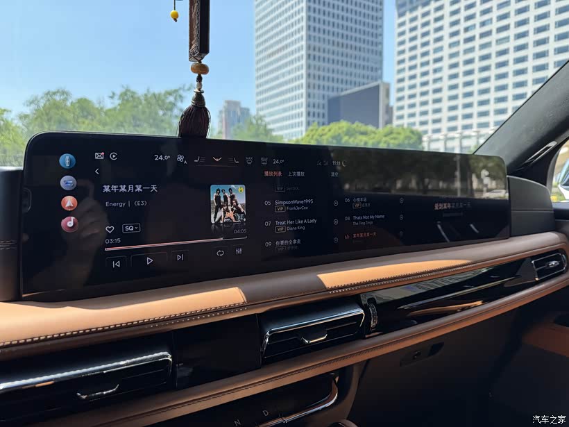 HUD显示续航里程、车速、导航信息、以及IACC和主动驾驶辅助等信息,驾驶过程中基本可以不用再看仪表盘,字体清晰而且全部为蓝色,与林肯的BlueCruise相呼应。仪表盘主要显示发动机转速、速度等各种行车信息,屏幕分辨率很高,显示细腻。中控屏是一块连通到副驾驶的27寸的4K屏,24款飞行家与老款最明显的区别在此,这块屏也属于中国特供屏,是林肯对中国市场新能源车引导的大屏流行趋势的一种迎合,点个赞!这块屏应该是这个级别油车最大的屏幕,触屏响应速度很快,车机语音应答也不错。我以前是用手机连接CarPlay,投屏后用百度地图导航,用其他手机软件听歌、听故事。现在手机还是连接CarPlay,但是用CarPlay只用来接听电话,听歌用车机的QQ音乐,听故事用车机的喜马拉雅,听新闻和音乐广播用车机的云听,这三个APP是我平时开车常听的,刚好在车机上有,林肯太了解我了,哈哈!当然,这块中控屏最大的优点就是能让副驾女王看片,可以插U盘看,也可以在爱奇艺里看(我的爱奇艺会员在车上也能用了)。但这样就会有流量不足的问题,百度地图是不限流量,其他软件每个月只有1.2G的免费流量。不过这个问题很好解决,在《林肯之道》上可以购买无限流量,每月30块或者每年300块,我买了包年的,现在无损音乐随便听,高分辨率电影随便看。第二排触控屏主要是调节后排空调和座椅加热通风等,待机时只显示时间,比较简洁。