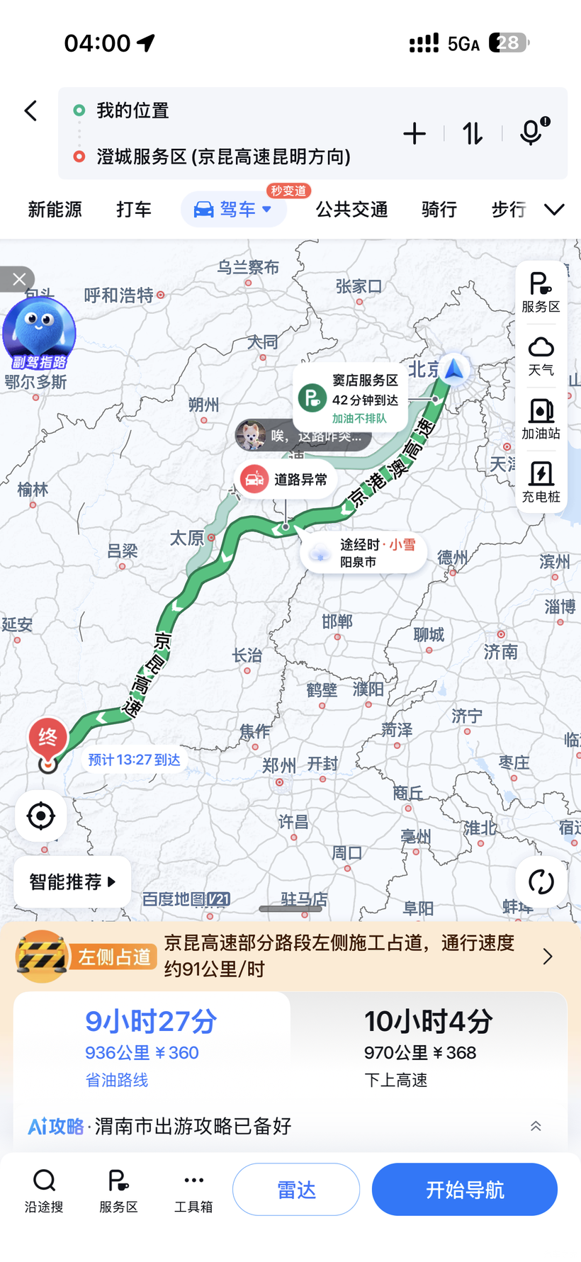 26年春节准备来一次长途自驾游,路线为北京-四川-三到四个省份-北京,深度了解飞行家高速油耗情况。周五晚上很早就睡了,周六一早起来去家旁边的加油站加满油准备出发。出发前里程20079.6,目的地设为京昆高速澄城服务区(昆明方向)。之所以选择这里是因为此地距离936公里,预估满箱油能跑到那里。