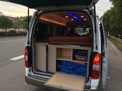 后门储物柜,一柜多用、把门板放下可以用做操作台,切菜[呲牙]旁边有洗菜盆,水靠直流水泵自动抽上来,有一个50升的净水桶,污水直接排到车外,水龙头上方有一个LED的台射灯,方便夜间操作,很方便啦!