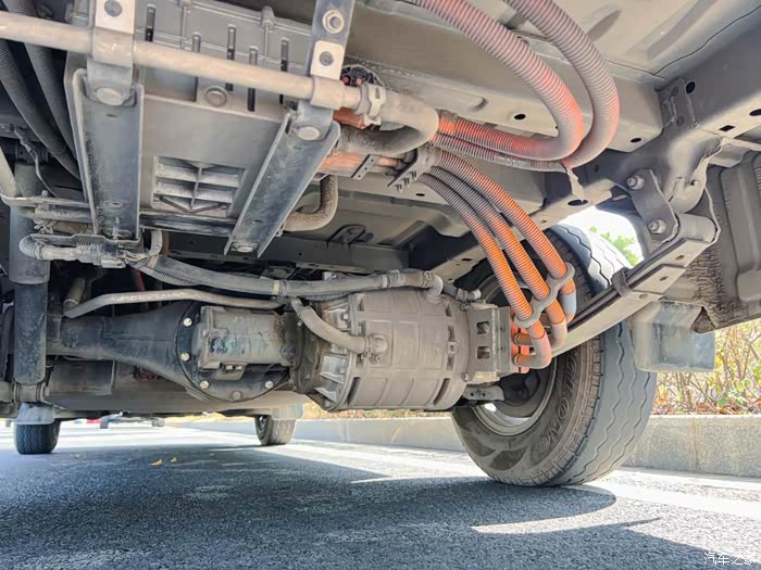我先是跟兄弟介绍了一下这台车的底盘,因为是纯电车,所以底盘的话其实比较显眼的就是电池,然后不同于油车的各种油路管道,电车底盘基本是粗大的电线,然后我这台车也跑了快5万公里了,底盘基本没有啥磨损,只是泥垢比较多,今年跑城乡客运比较多,年初的时候还会偶尔冲洗一下,后面就懒得了,过两天就一层泥了。