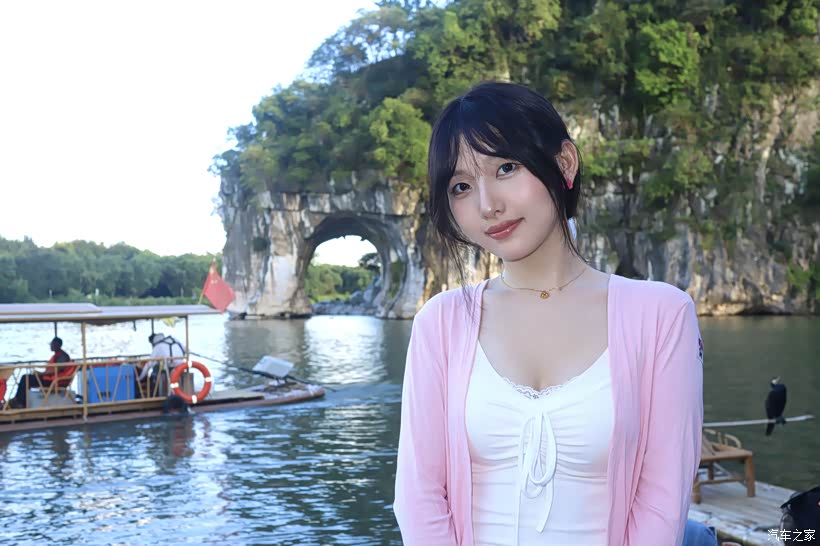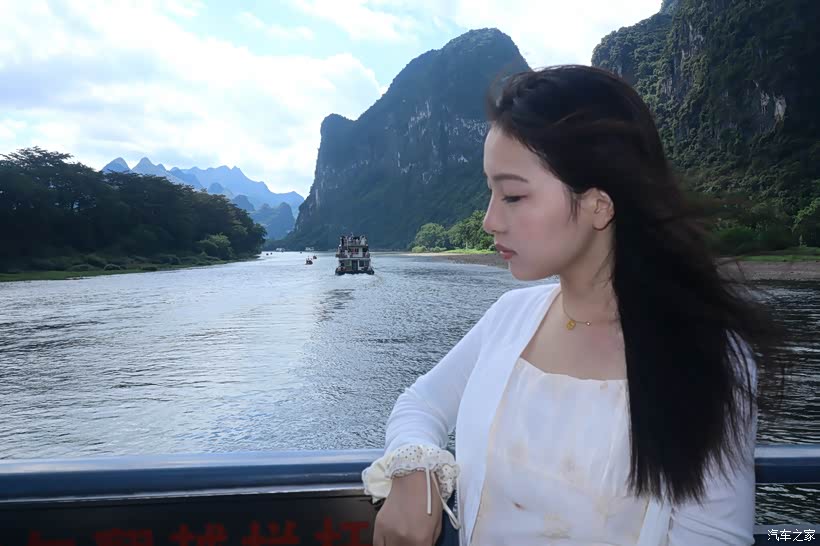 在漓江游轮上她穿着条飘逸的白裙子,两岸青山绿水当背景,阳光洒在她脸上,在那低头专注看风景的样子,就跟画里走出来的人儿似的。