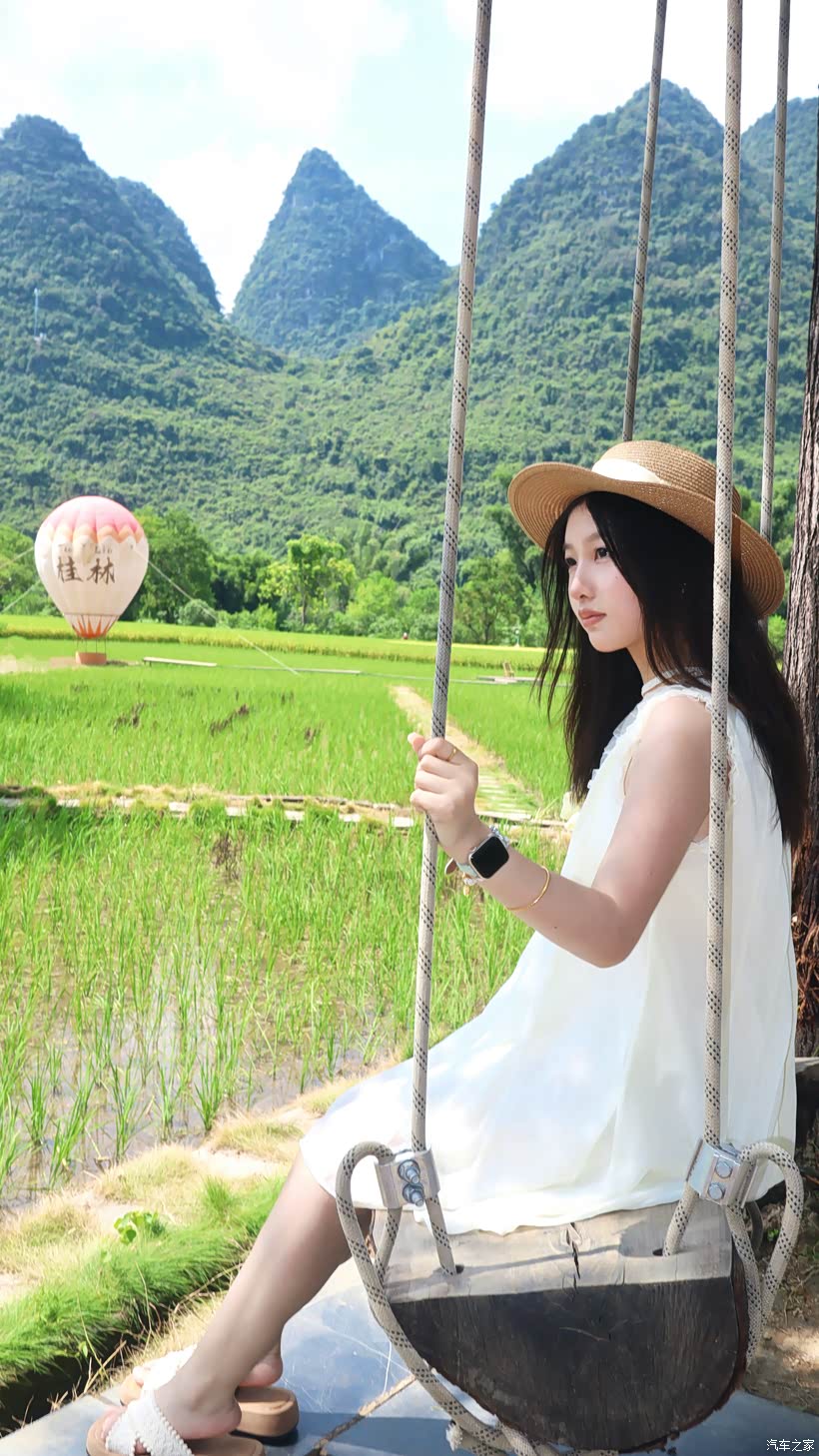 到了阳朔,在麦田间荡秋千,她穿了件浅白色的连衣裙,抬头往麦田深处看。阳光洒在她头发上,连麦芒都闪着光,我赶紧抓拍,画面里全是夏天的清新劲儿。